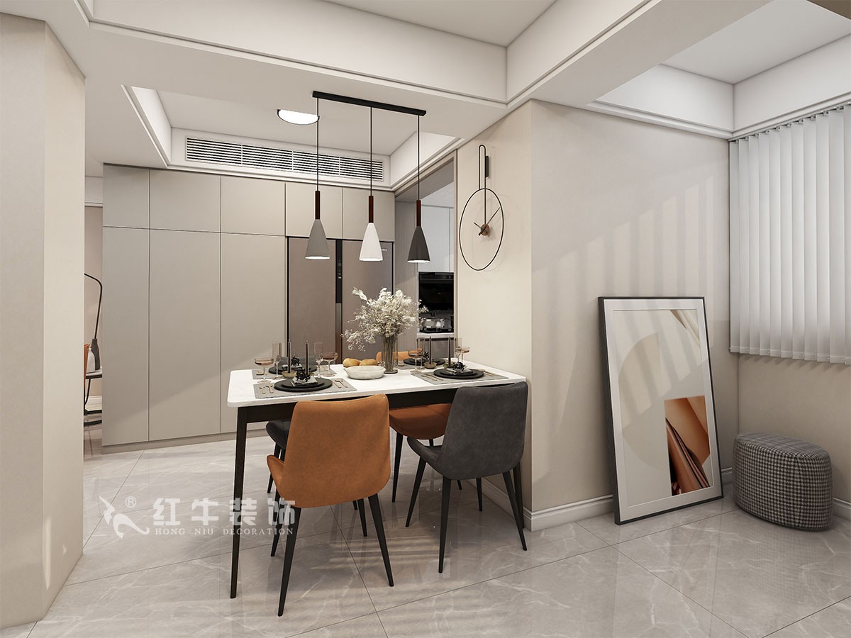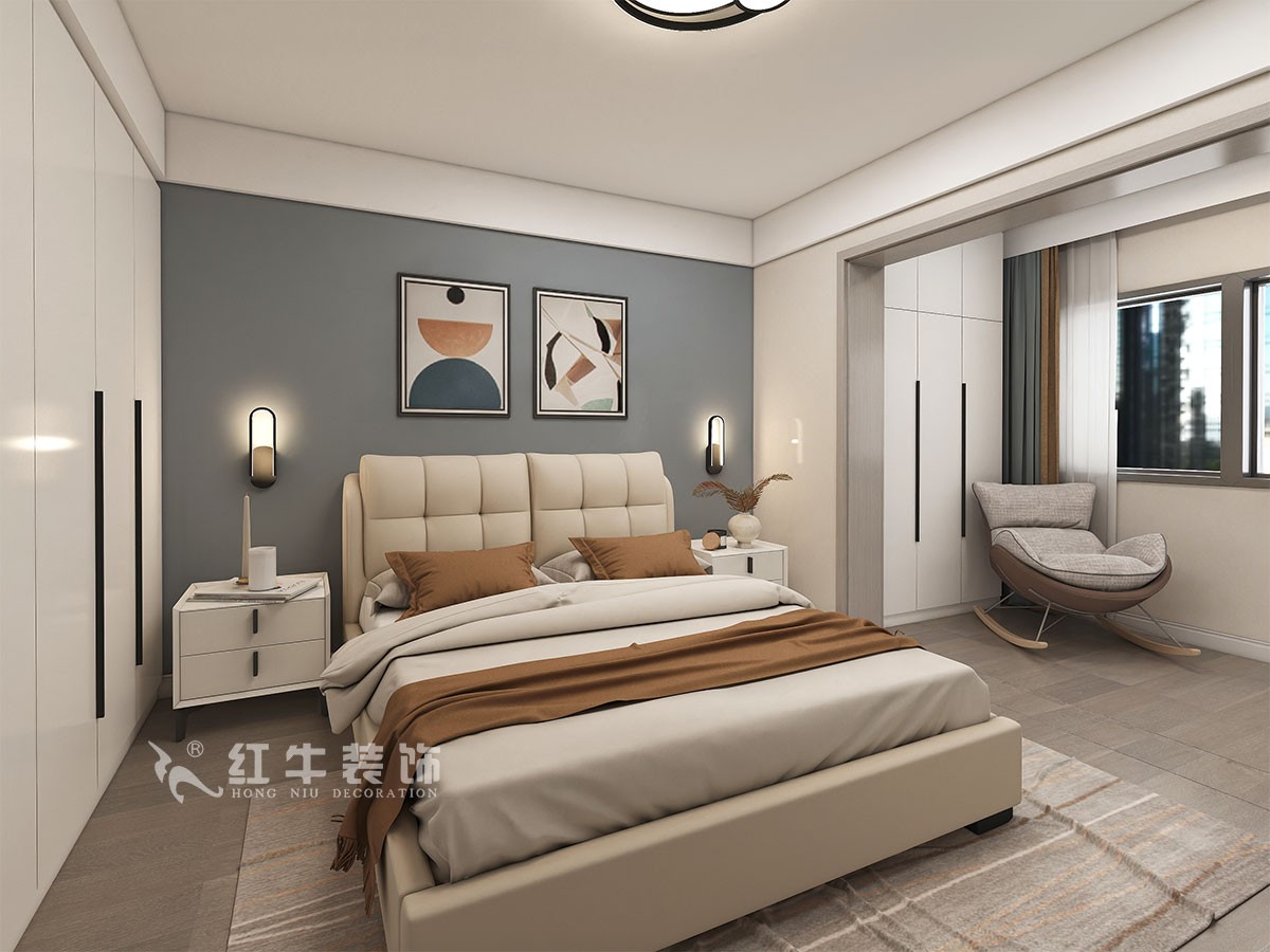 此案主要是婚房居住,在舒適度上要求比較高,臥室是整套房子中最私人也是最體現(xiàn)出溫馨休閑感的空間,在設計時體現(xiàn)出靜謐舒適的感覺,并且與其他空間明顯的區(qū)別,利用衛(wèi)生間砌墻,把電視掛墻上,把冰箱嵌入餐廳柜子,更好的布局。這樣舒適度更好,區(qū)域劃分明顯,動靜分離。吊頂簡潔大氣,配以輕現(xiàn)代家具,完美闡釋了簡約風格。整體現(xiàn)代簡約風格的設計,搭配上顯眼的綠色植物讓整個空間呈現(xiàn)出一種生機勃勃的自然美。