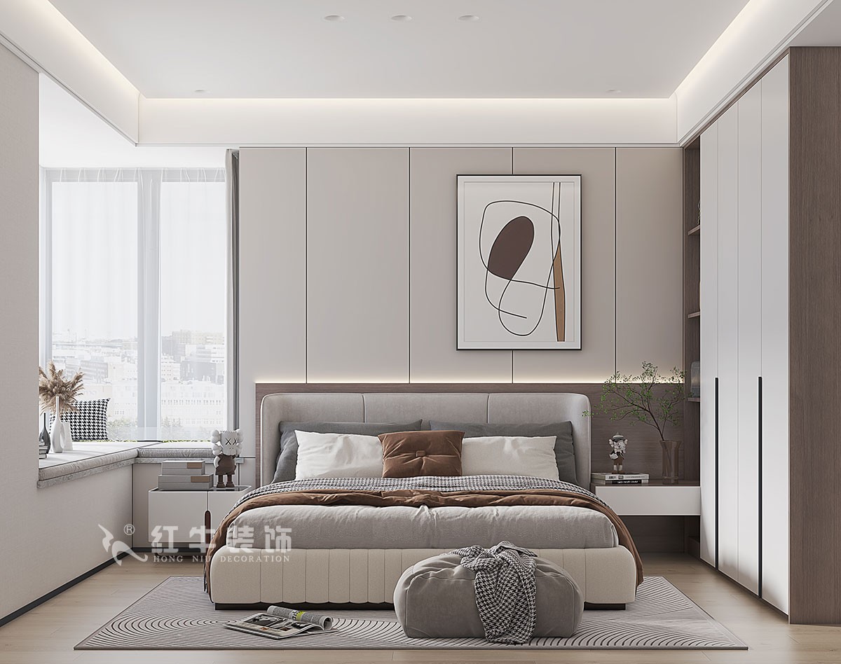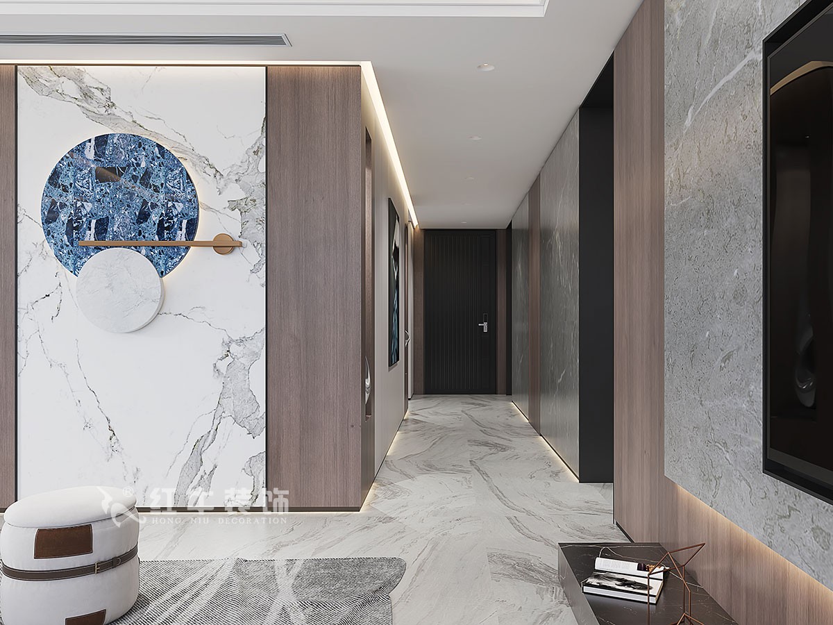 4、整體風(fēng)格現(xiàn)代輕奢,餐廳墻面的裝飾面板窗簾槽,和酒柜顏色統(tǒng)一,懸浮吊頂?shù)脑O(shè)計(jì),淺灰色的石材地面,墻深地淺的設(shè)計(jì),讓整個(gè)空間看上去沉穩(wěn)中不失時(shí)尚。客廳電視背景墻整體石材+裝飾面板護(hù)墻,電視機(jī)柜采用石材地臺(tái)形式,板簡潔沉穩(wěn)過道墻面和電視背景墻形成整體,石材和裝飾面板搭配,另外一面是兩個(gè)儲(chǔ)藏室的門,均采用“電動(dòng)巴士”門的設(shè)計(jì),因?yàn)檫^道比較長,墻面上的兩個(gè)壁龕和內(nèi)嵌裝飾畫,完美的解決了這個(gè)問題。主臥室L形的飄窗,搭配灰色的飄窗軟墊,讓整個(gè)空間更有柔性的美,臥室的背景墻也和柜子形成了一體,床頭柜直接從柜子中延伸出,上方開放式個(gè)隔層,方便房屋主人擺放一些書籍和裝飾品。