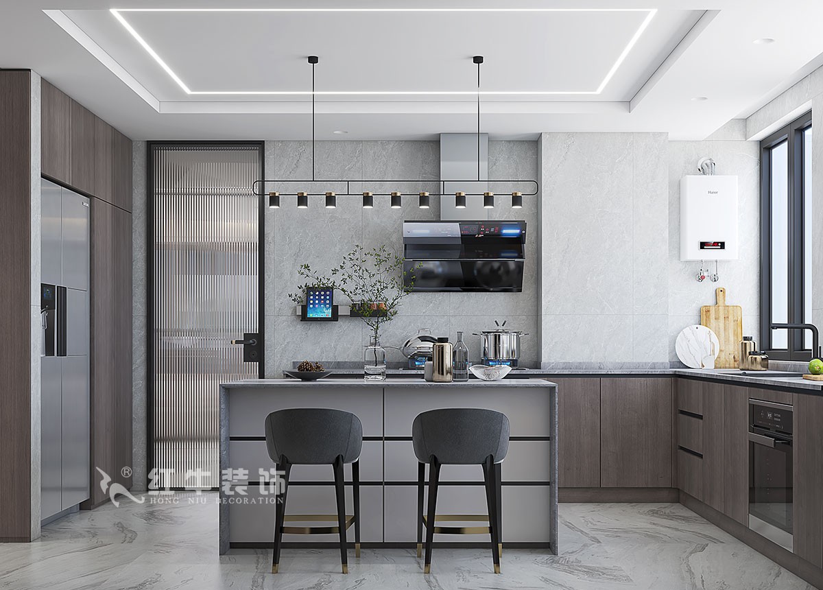 2、超大的廚房有19.2平方,廚房櫥柜設(shè)計(jì)成G字形。操作使用方便,吧臺(tái)的設(shè)計(jì)增加了家人之間的互動(dòng),同時(shí)也可以再餐廳完成簡餐。