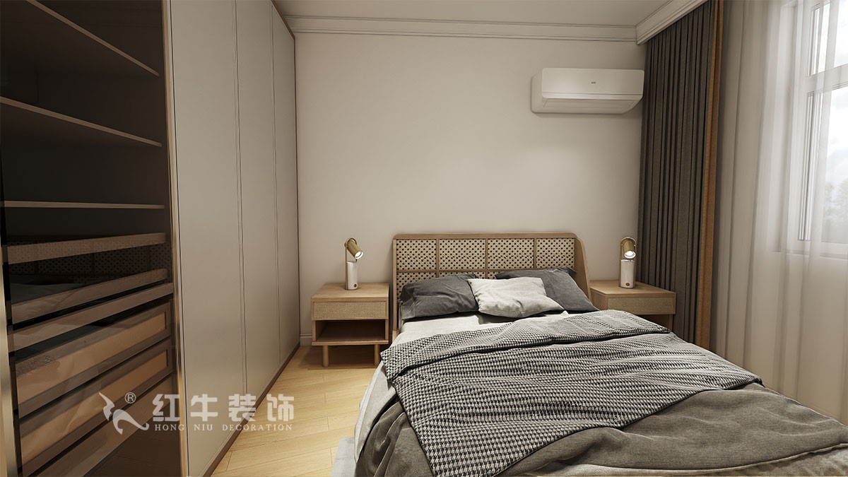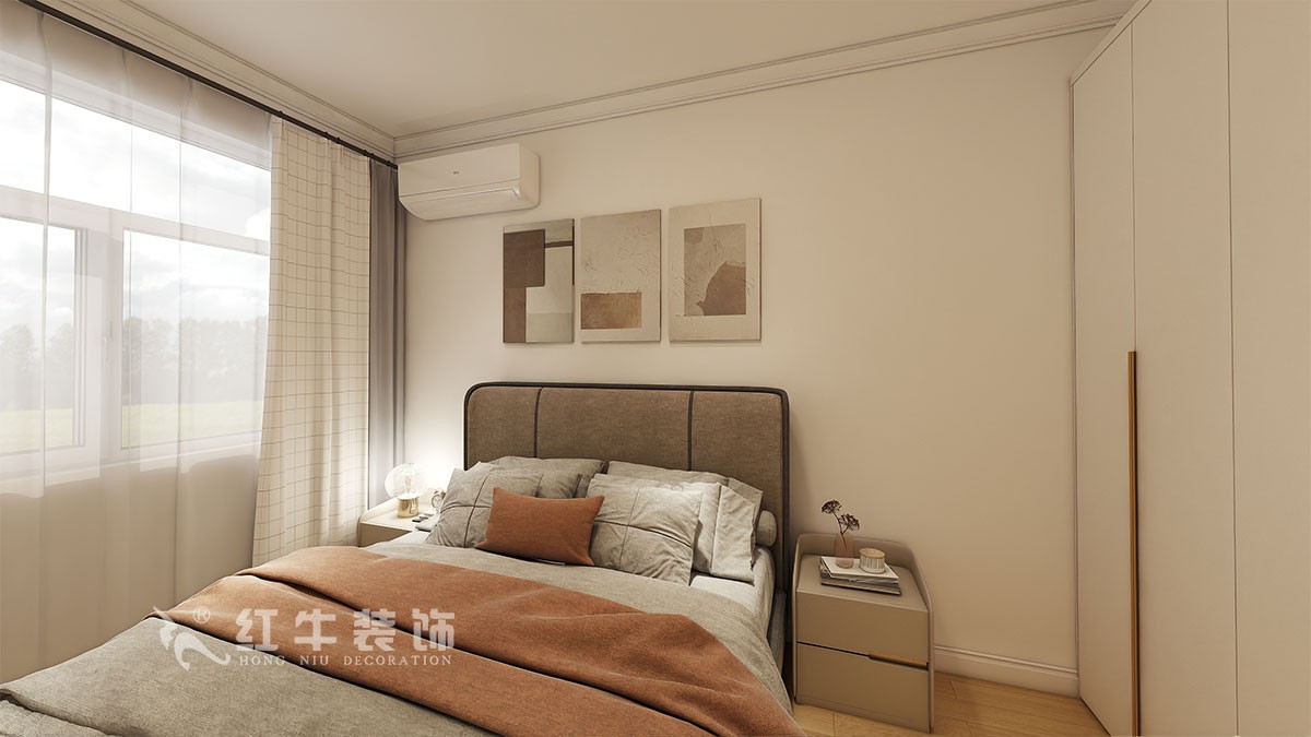 主臥室的更加簡單,無吊頂設(shè)計(jì)使空間更加不壓抑,木色大床更適合老人的居住需求和觀感,整個空間色調(diào)柔柔的,很適合臥室的氛圍感。