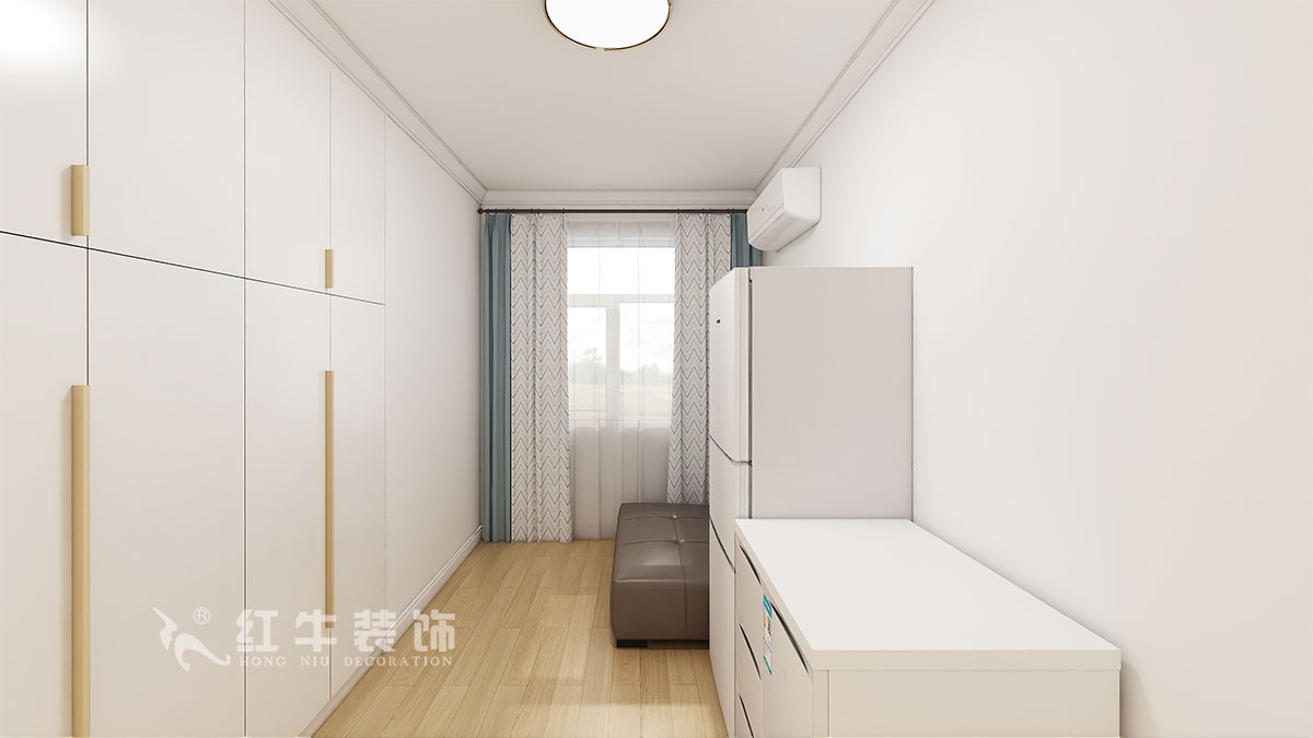 次臥室的石膏線條,暖色墻面,新中式家具,白色的柜子,空間清新一門到頂?shù)脑O(shè)計(jì)使空間得到拉伸。