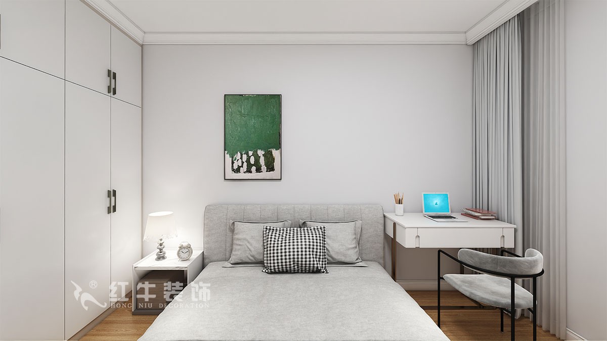 臥室無(wú)吊頂,石膏線條設(shè)計(jì),使空間更加不壓抑。白灰色的大床和奶茶色的柜子相得益彰,更適合兩人的居住需求和觀感。整個(gè)空間色調(diào)溫和,很適合臥室的氛圍感。