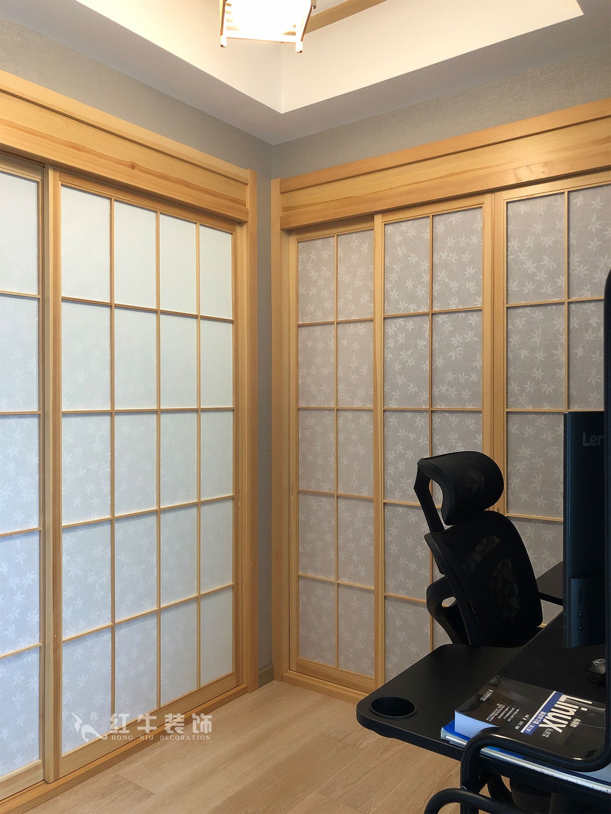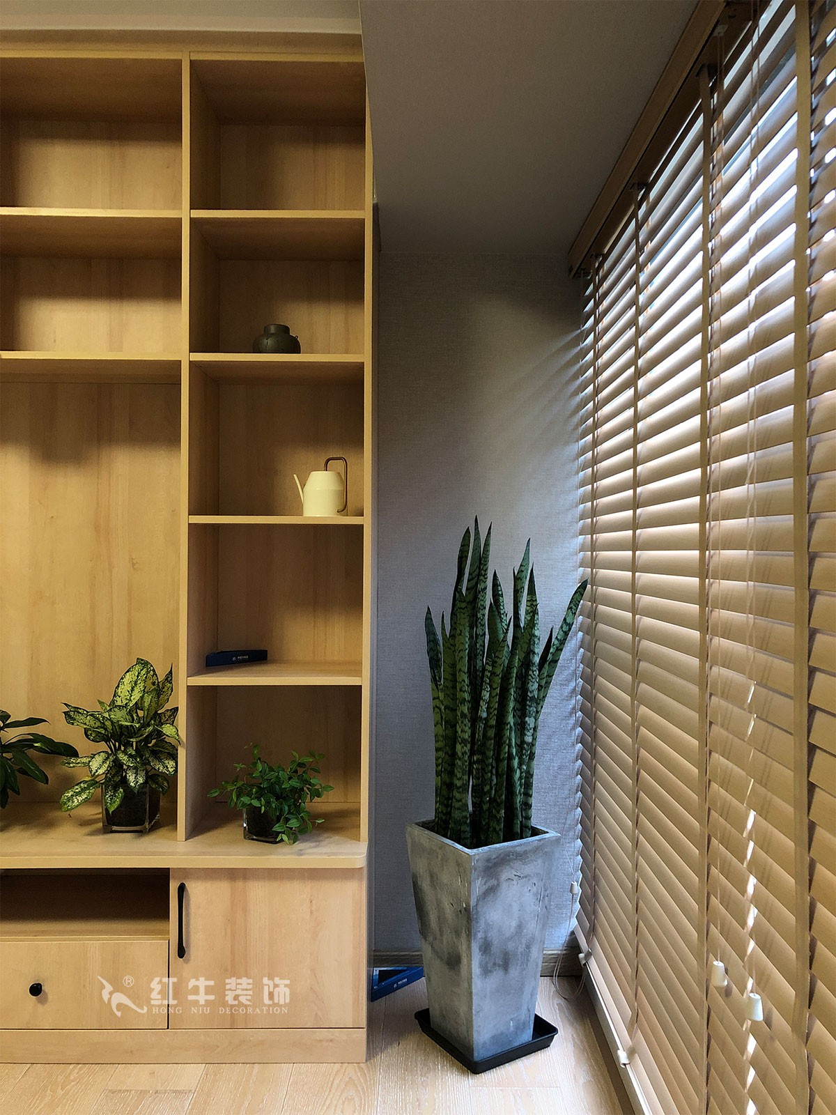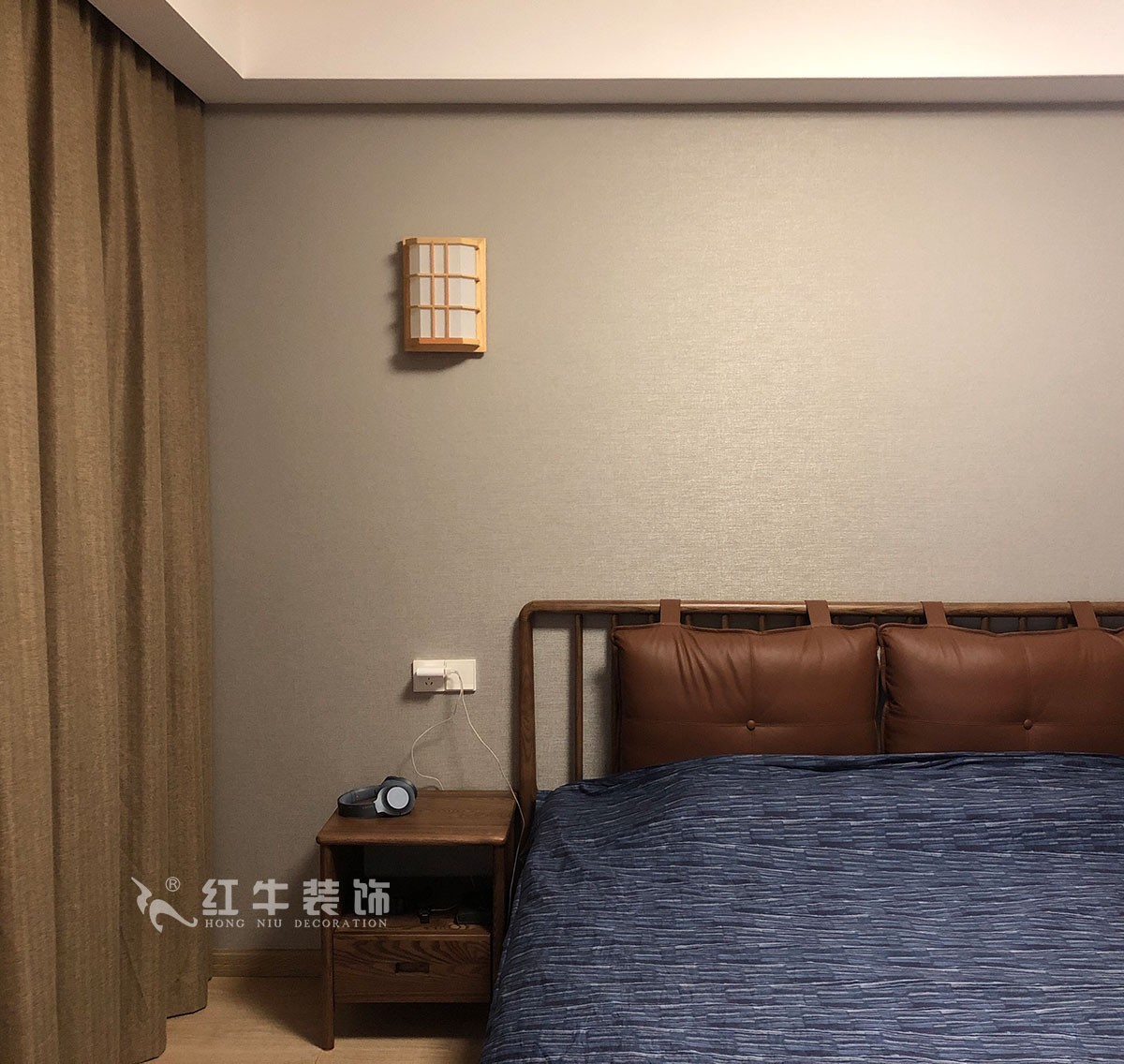 客餐廳色調(diào)清雅,休閑、隨性,又不失精致。電視背景墻依靠大面積開放柜拓展儲(chǔ)物及裝飾功能,給居住者一個(gè)慵懶、明快的起居環(huán)境。臥室,依靠木質(zhì)家具本身的線條感,搭配同樣風(fēng)格的日式壁燈,給人以休閑自在的視覺感受。書房是辦公空間,整面墻全部以臥室同色的麻灰色墻布鋪貼,書桌旁轉(zhuǎn)角的飄窗給了原本不大的空間一個(gè)視覺的開放性,心情也自然就舒緩很多。