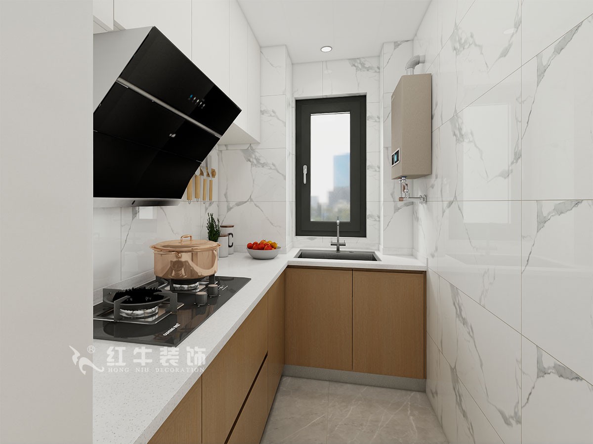 戶型比較規(guī)整,廚房做推拉門(mén)相比平開(kāi)門(mén)來(lái)說(shuō)更加節(jié)省空間。次臥的窗戶外移,增加了一組書(shū)桌的空間,整體空間充分利用起來(lái)??蛷d選擇簡(jiǎn)約款式家具,整體簡(jiǎn)單又清爽。