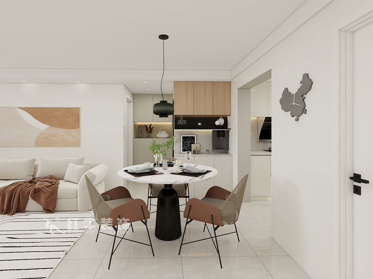 餐廳說明:餐邊柜擴(kuò)充了廚房儲物的不足,也提升了適合夫妻的生活質(zhì)量。