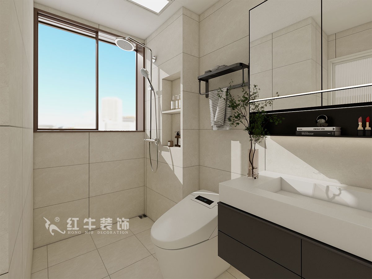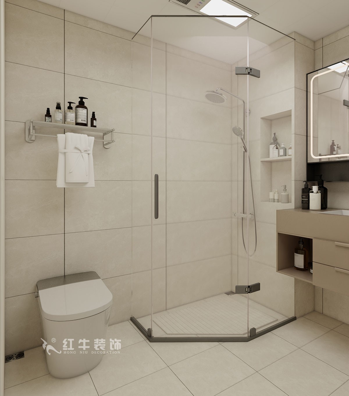 衛(wèi)生間說明:干區(qū)選擇整體色彩搭配干凈、大方,選擇大尺寸米色瓷磚上墻,氛圍感溫馨感滿滿。
