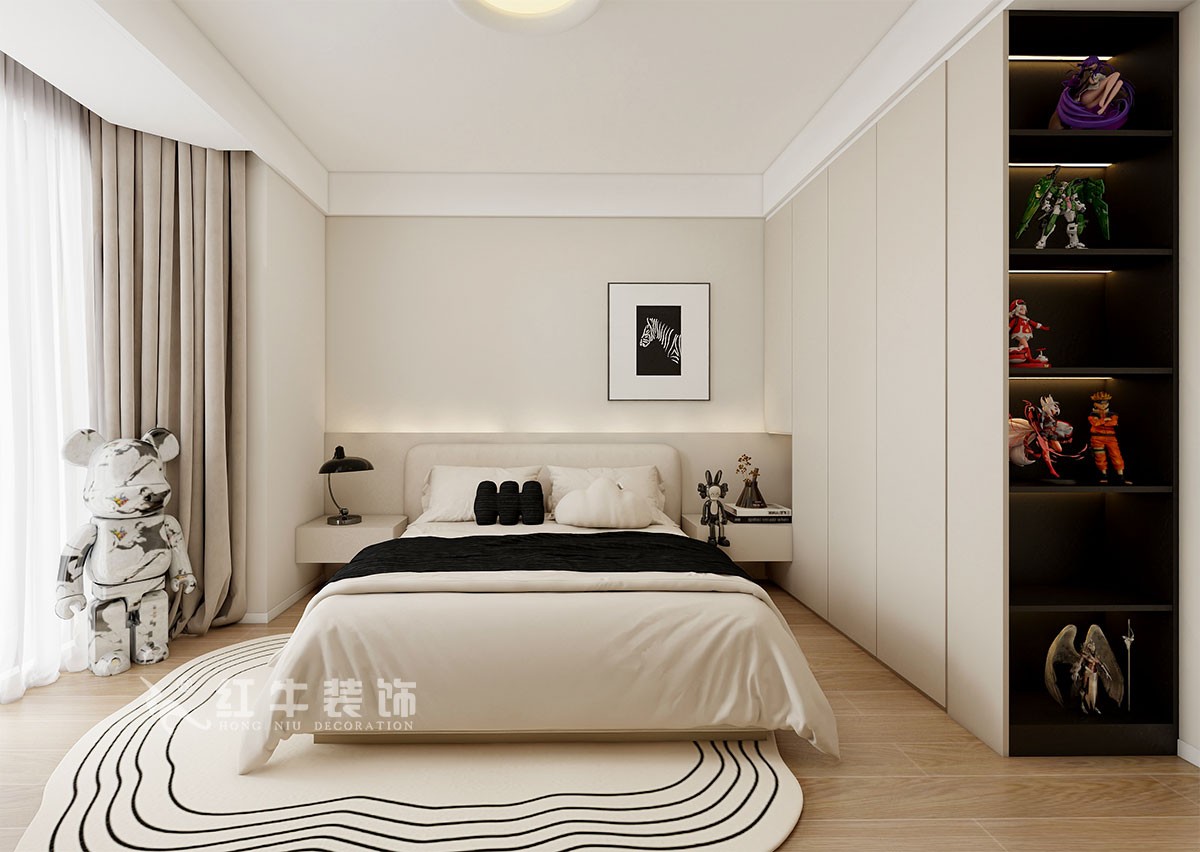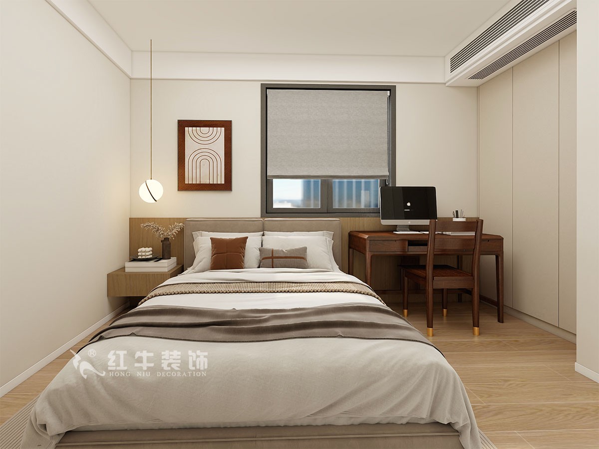 臥室說(shuō)明:搭配大面積的咖色定制衣柜,床頭的光源以多種形勢(shì)呈現(xiàn),滿足不同燈光需求,又恰到好處地起到了裝飾效果,使整體臥室空間呈現(xiàn)柔亮、溫柔的舒適狀態(tài)。