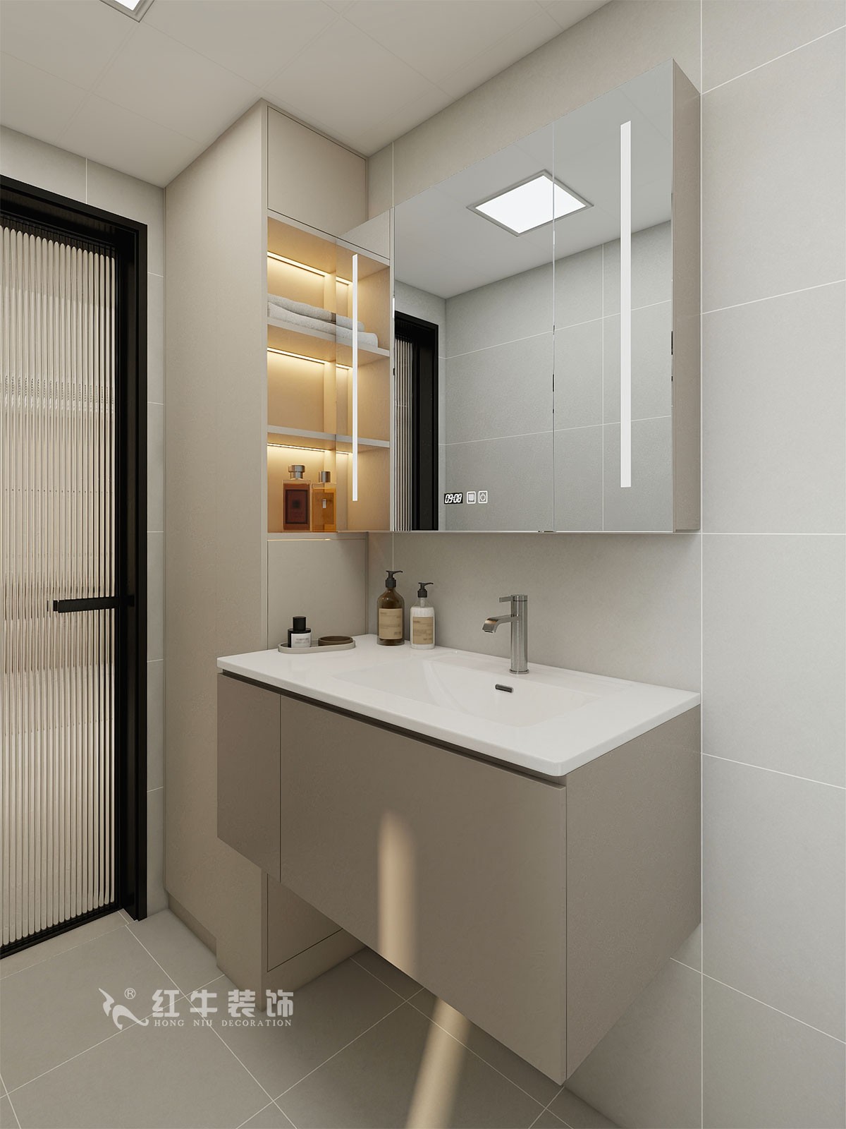 衛(wèi)生間說(shuō)明:選擇整體色彩搭配干凈、大方,選擇大尺寸淺灰色瓷磚上墻,氛圍感溫馨感滿滿。