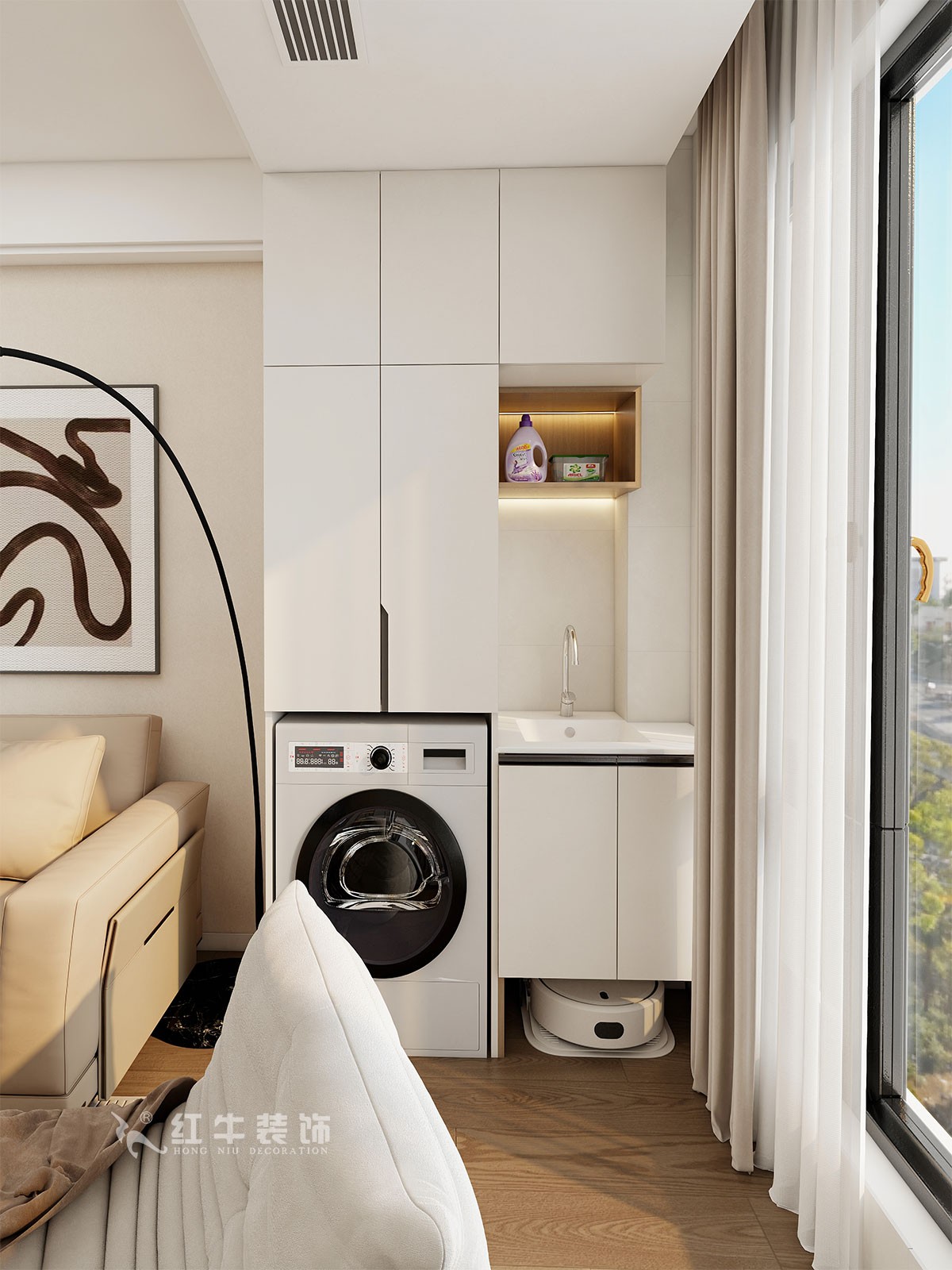 奶灰色是客戶非常追求的色彩,加上地板的質(zhì)感,相得益彰。