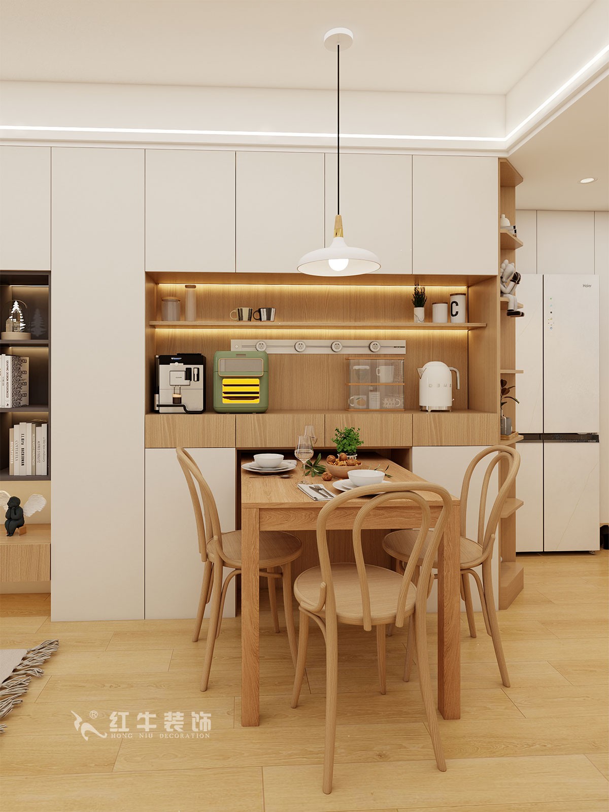 餐廳說明:餐邊柜擴充了廚房儲物的不足,也提升了適合家庭的生活質(zhì)量。