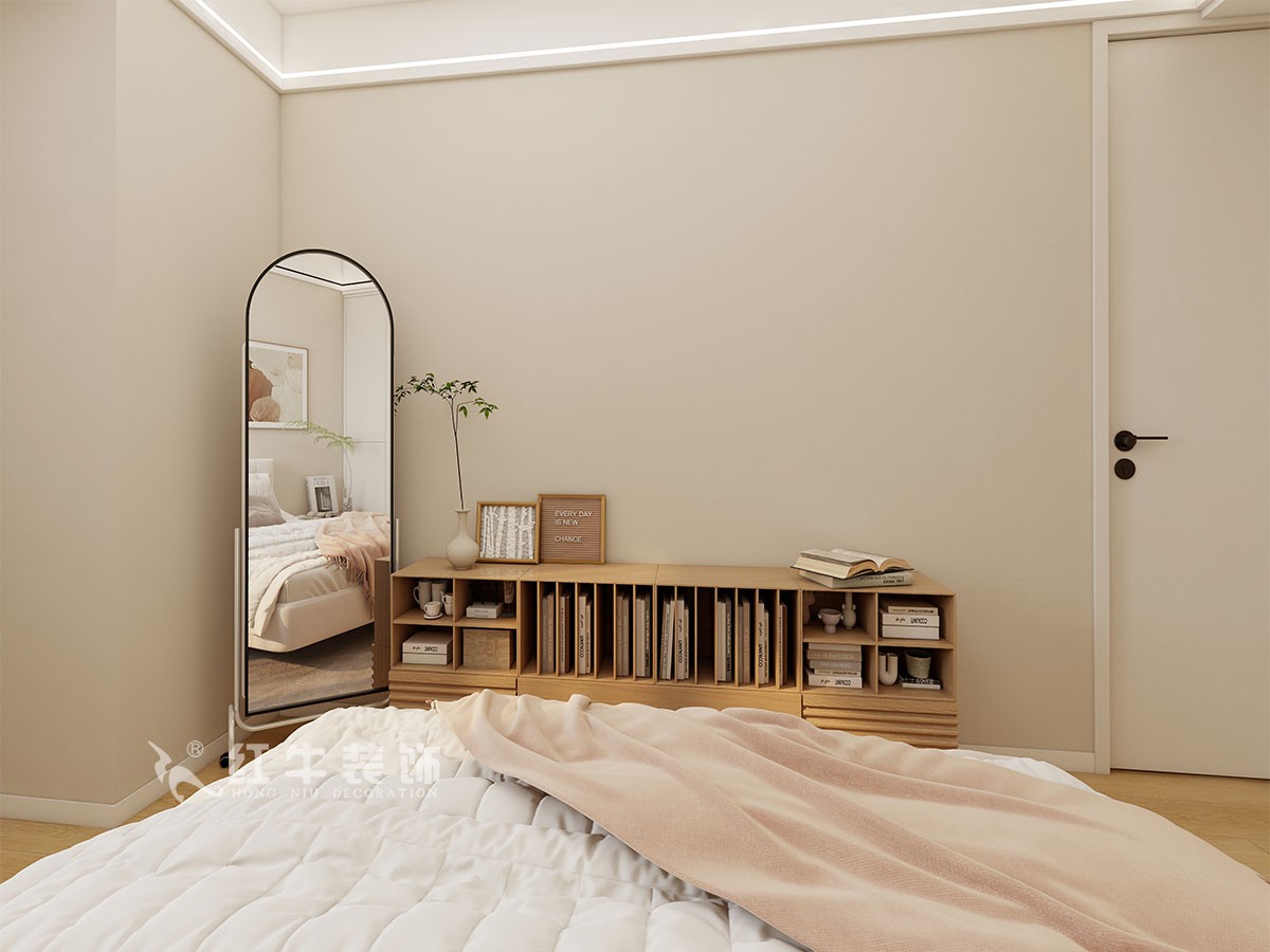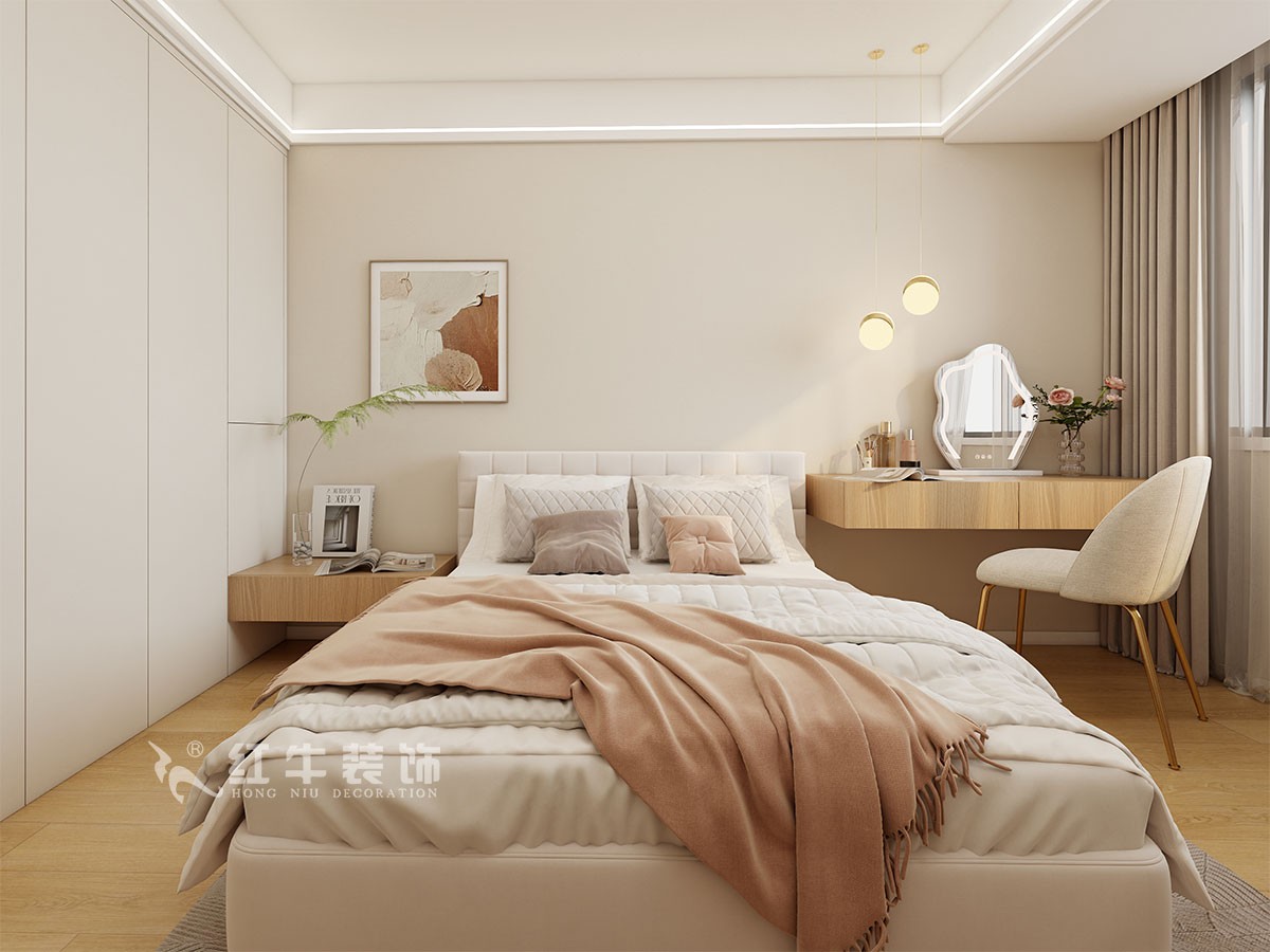 臥室說明:搭配大面積的白色定制衣柜,床頭的光源以不同形勢呈現(xiàn),既滿足不同燈光需求,又恰到好處地起到了裝飾效果,使整體臥室空間呈現(xiàn)明亮、溫柔的舒適狀態(tài)。