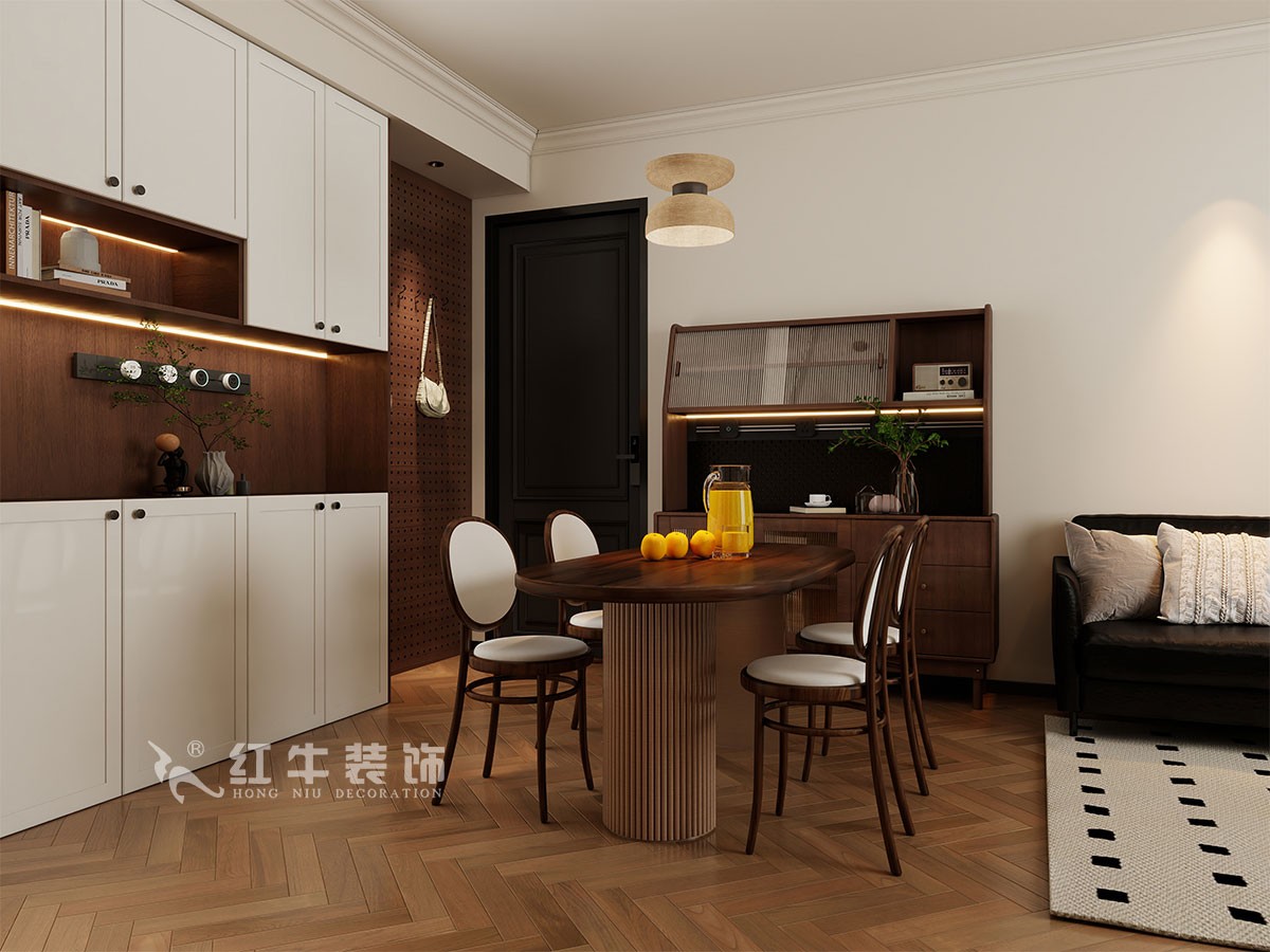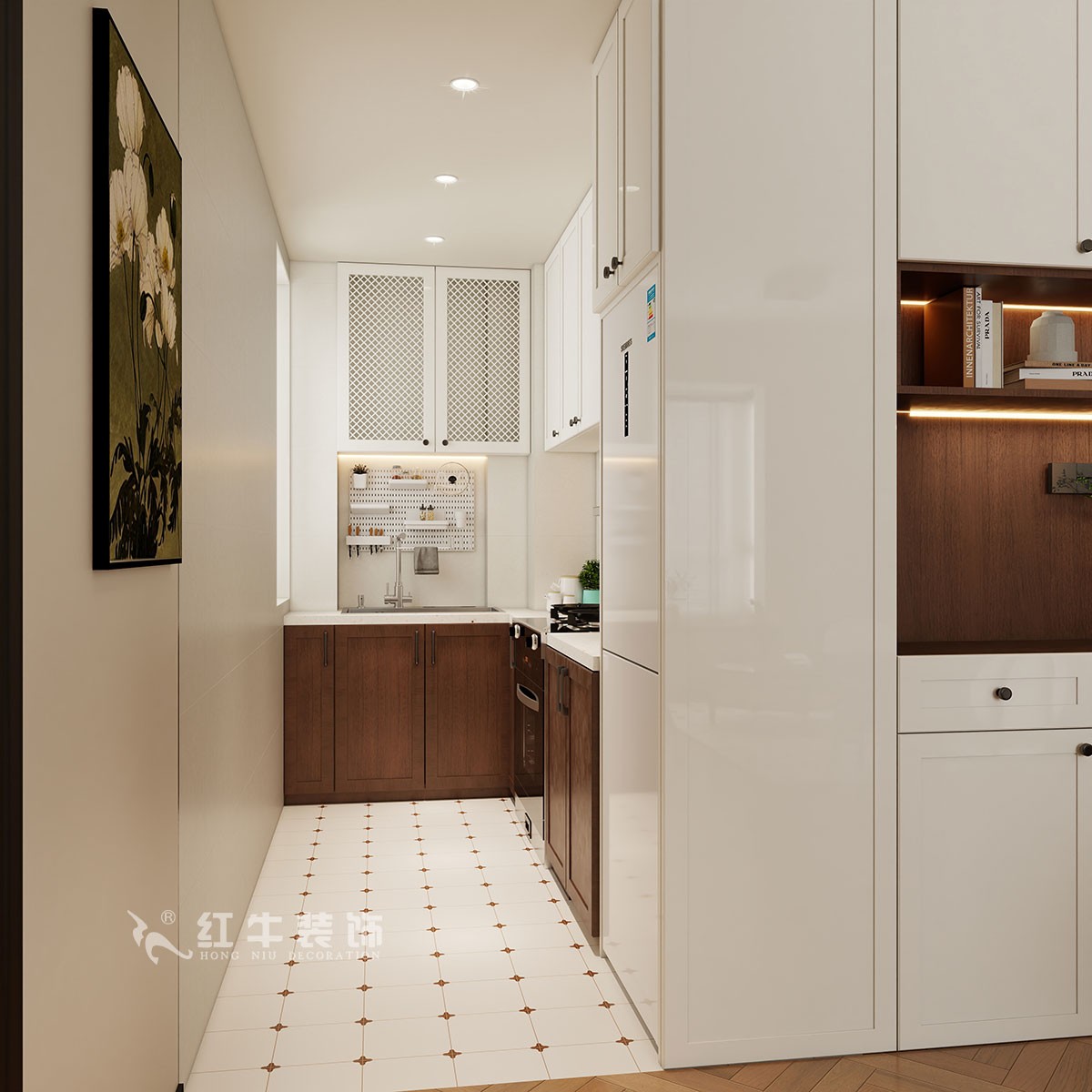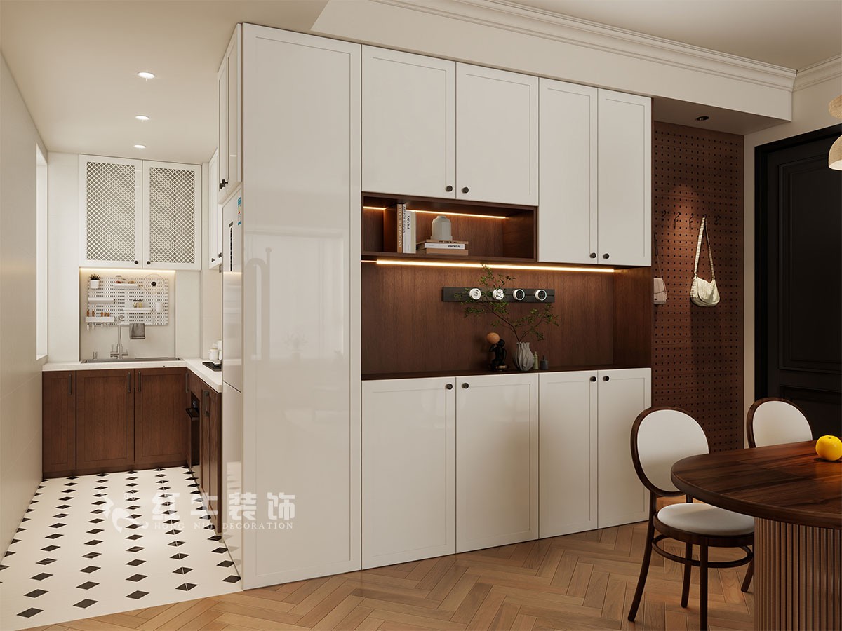 房子比較規(guī)整,廚房比較小,主要考慮冰箱的位置,正好利用餐邊柜設(shè)計(jì)和冰箱鏈接一起,空間更加整體。