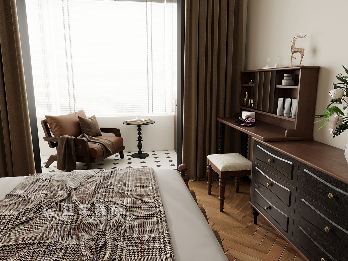 風(fēng)格定為復(fù)古風(fēng),人字拼的地板為中古風(fēng)奠定了基礎(chǔ),黑色木色相間,這些材質(zhì)與溫潤(rùn)的木色形成對(duì)比,看上去就不會(huì)很單調(diào),因?yàn)轱L(fēng)格大面積使用了深色,擔(dān)心空間暗,柜門(mén)用了白色,形成反差,從而達(dá)到視覺(jué)效果。累了坐在這,親手沖一杯咖啡,很是安逸。