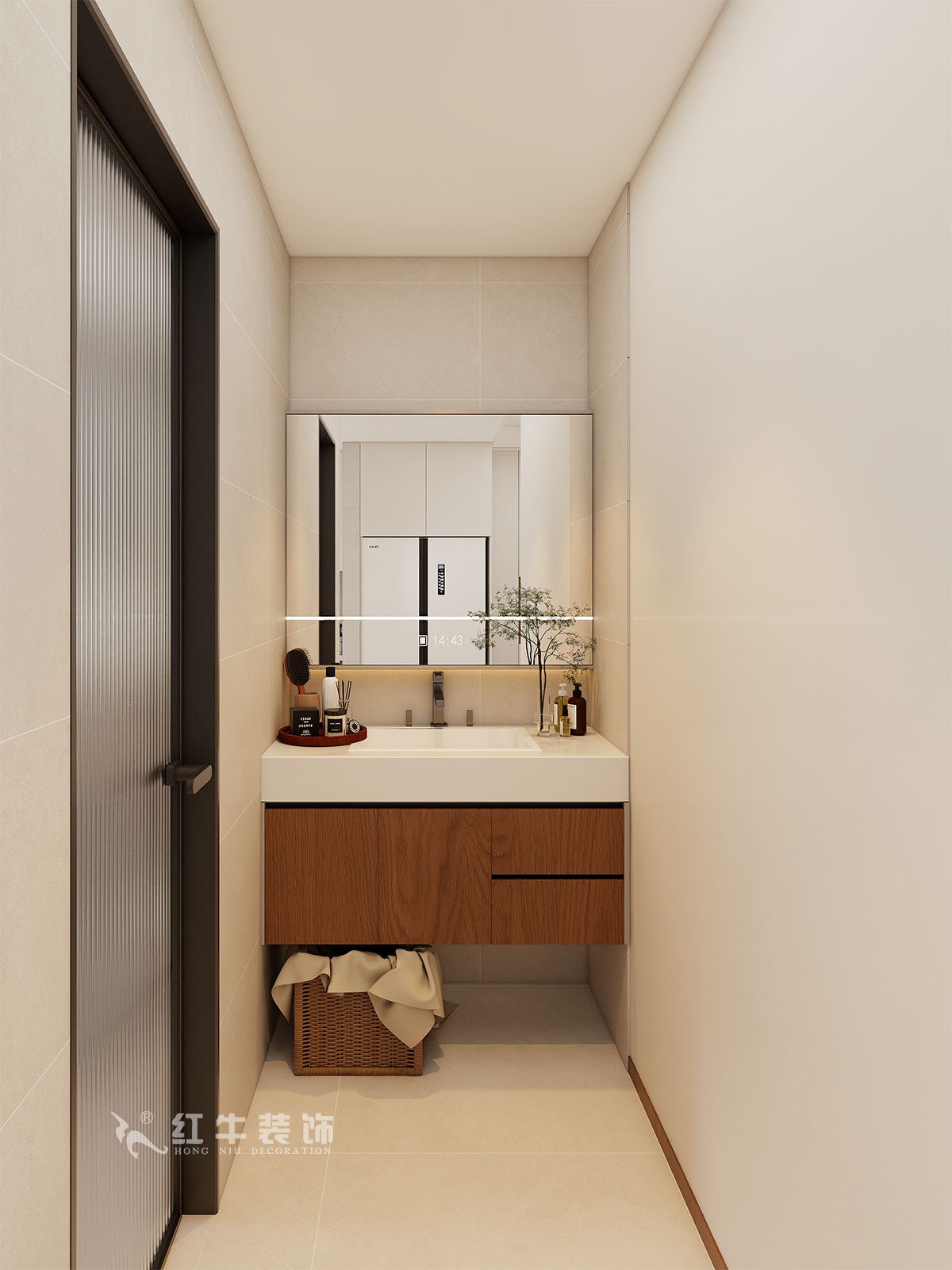 衛(wèi)生間說明:干區(qū)選擇整體色彩搭配干凈、大方,選擇大尺寸瓷磚上墻,高級(jí)感滿滿。