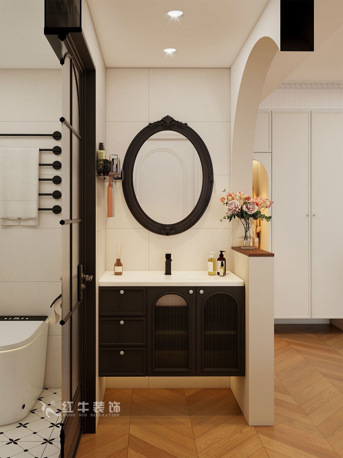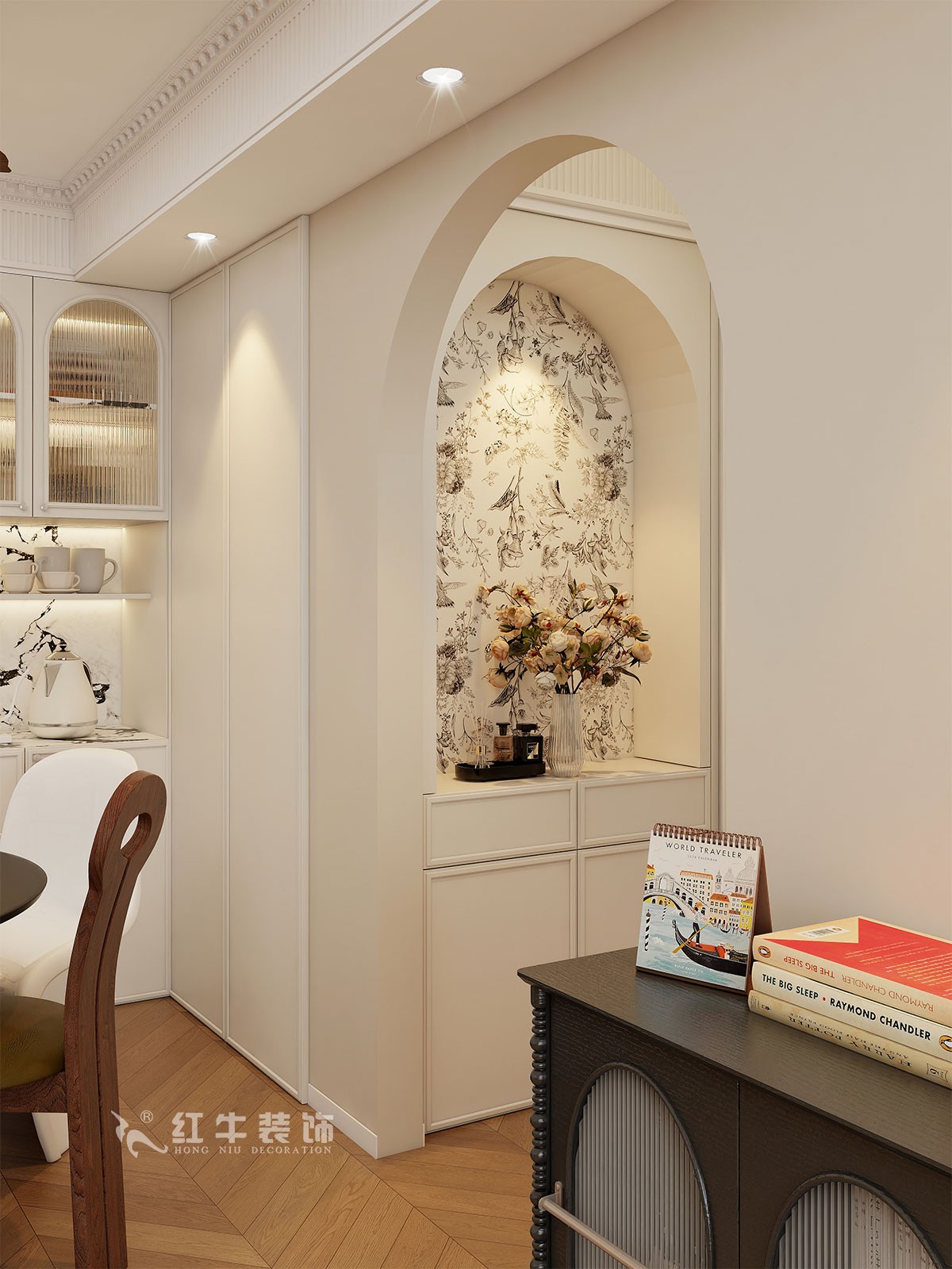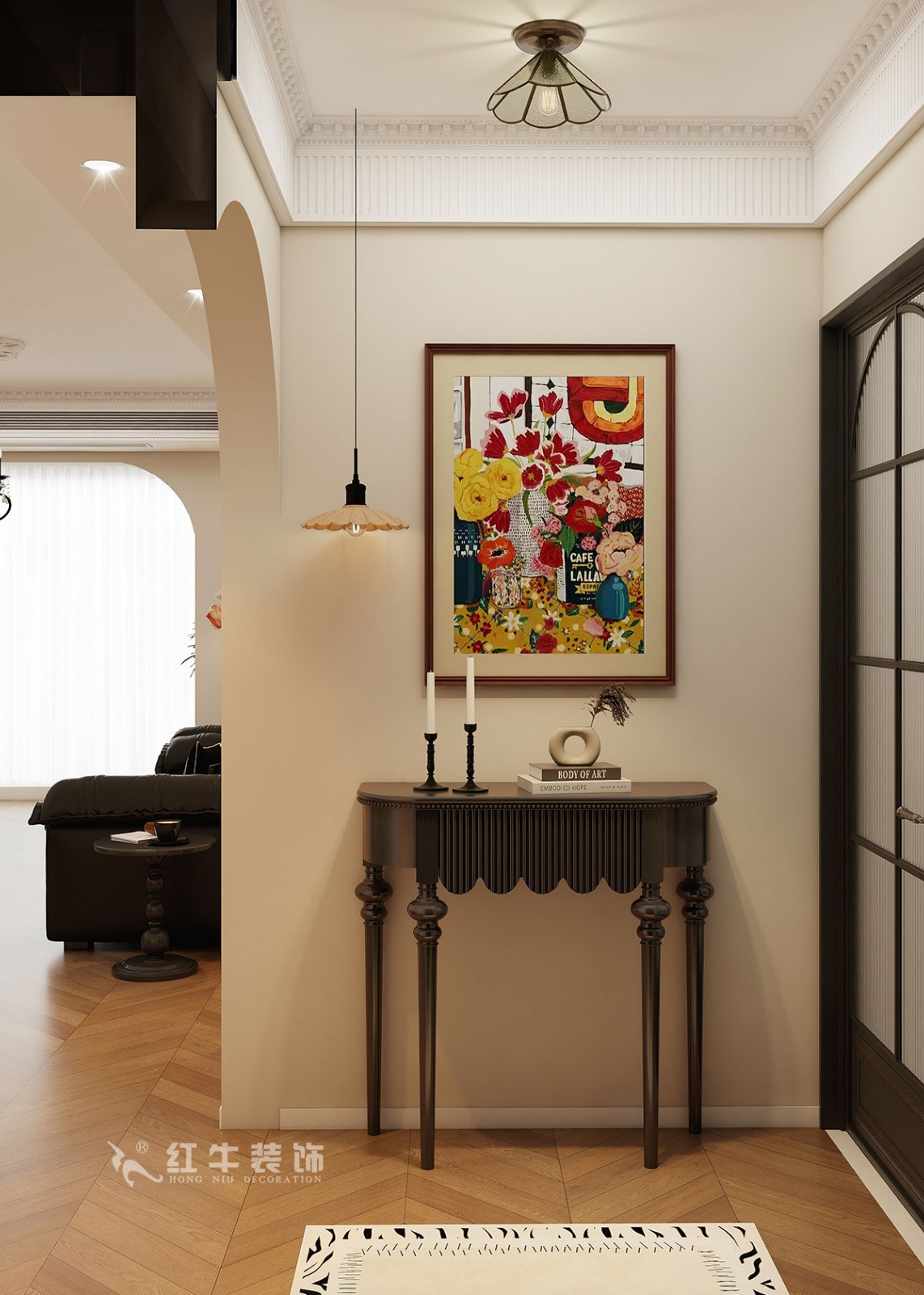 小兩口居住,女業(yè)主對(duì)裝修希望比較時(shí)尚大氣,希望未來(lái)的房子實(shí)用、大氣,最終確定了法式復(fù)古風(fēng),而本案在設(shè)計(jì)時(shí)其特色是將設(shè)計(jì)的元素、色彩、照明、原材料簡(jiǎn)化到最少程度。但是對(duì)材料的舒適度要求很高。因此,考慮全屋通鋪木紋地板磚,配合拱形門(mén),以極少的元素去表達(dá)空間的氛圍感。