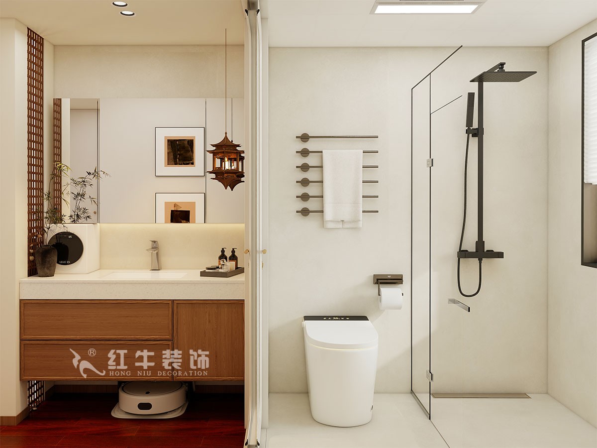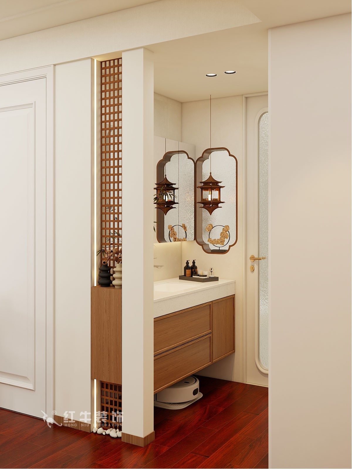 材質(zhì)運用:全屋通鋪地板,保留自然質(zhì)感的同時提升耐用性;衛(wèi)生間采用木格柵與吊燈組合,凸顯復(fù)古趣味。