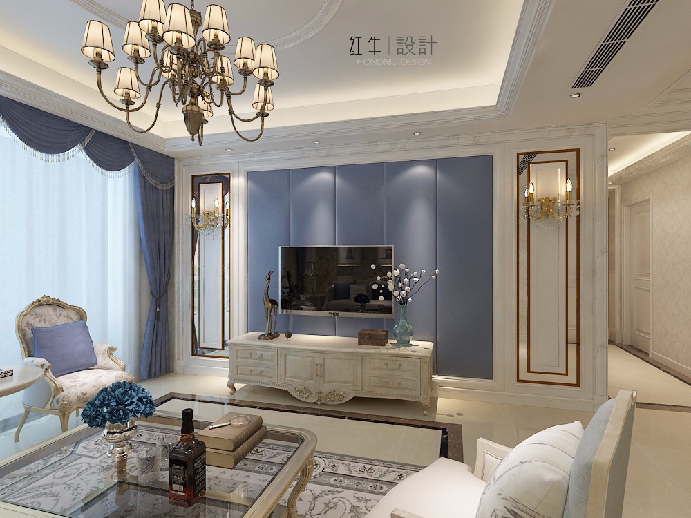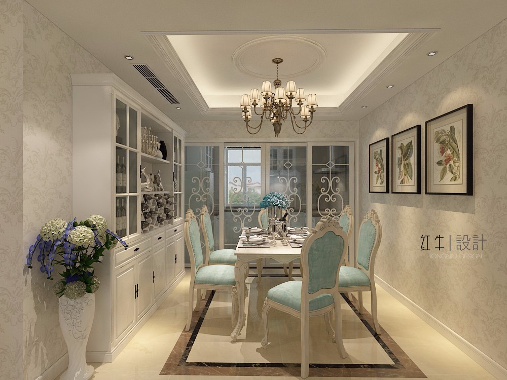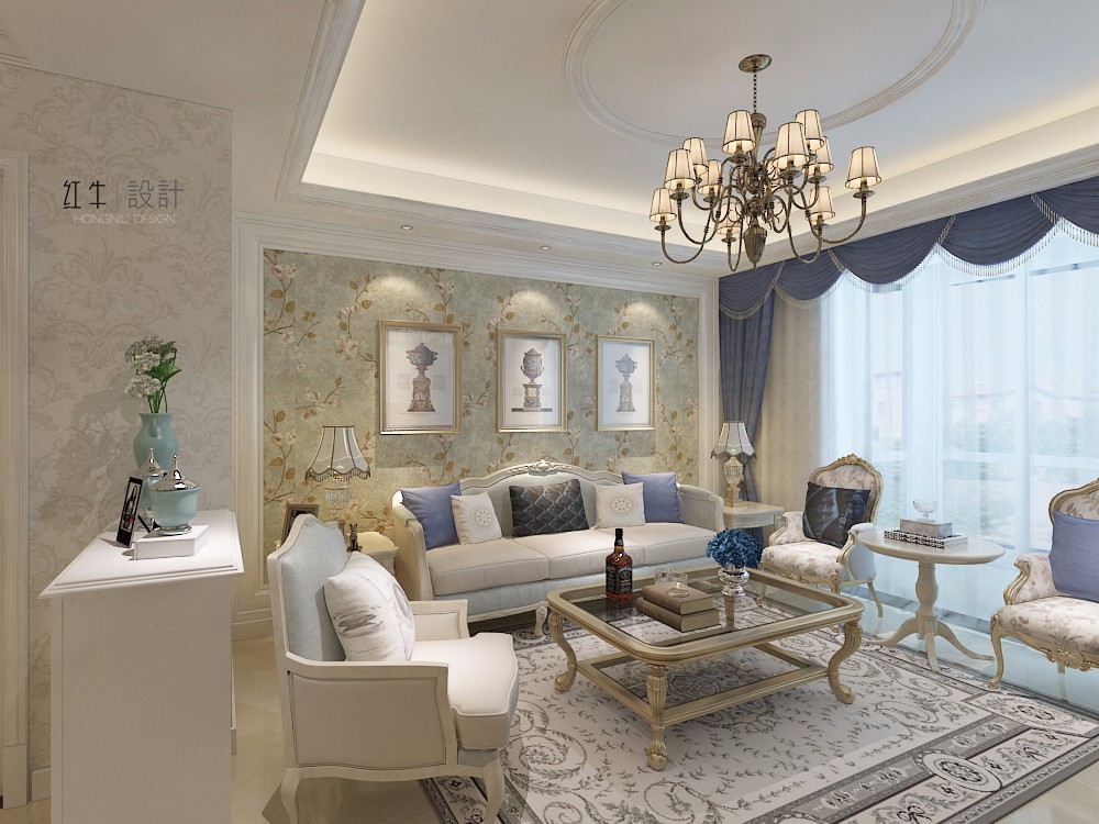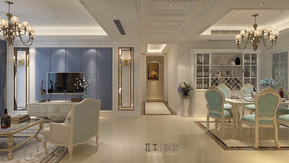 在設(shè)計(jì)的時(shí)候,居室色彩主調(diào)以白色,家具為古典彎腿式,部分家具和門(mén)為白色,采用嵌入式石膏吊頂和線條,搭配精致的水晶吊燈,營(yíng)造出浪漫的感。以磚面作為地面裝飾材料,有很好的光澤感,在沙發(fā)區(qū)鋪上大幅花紋地毯,使空間區(qū)域劃分更加清晰。