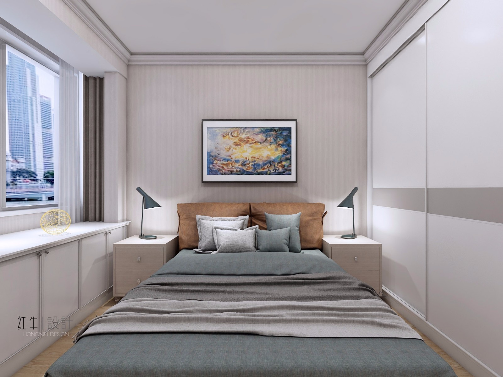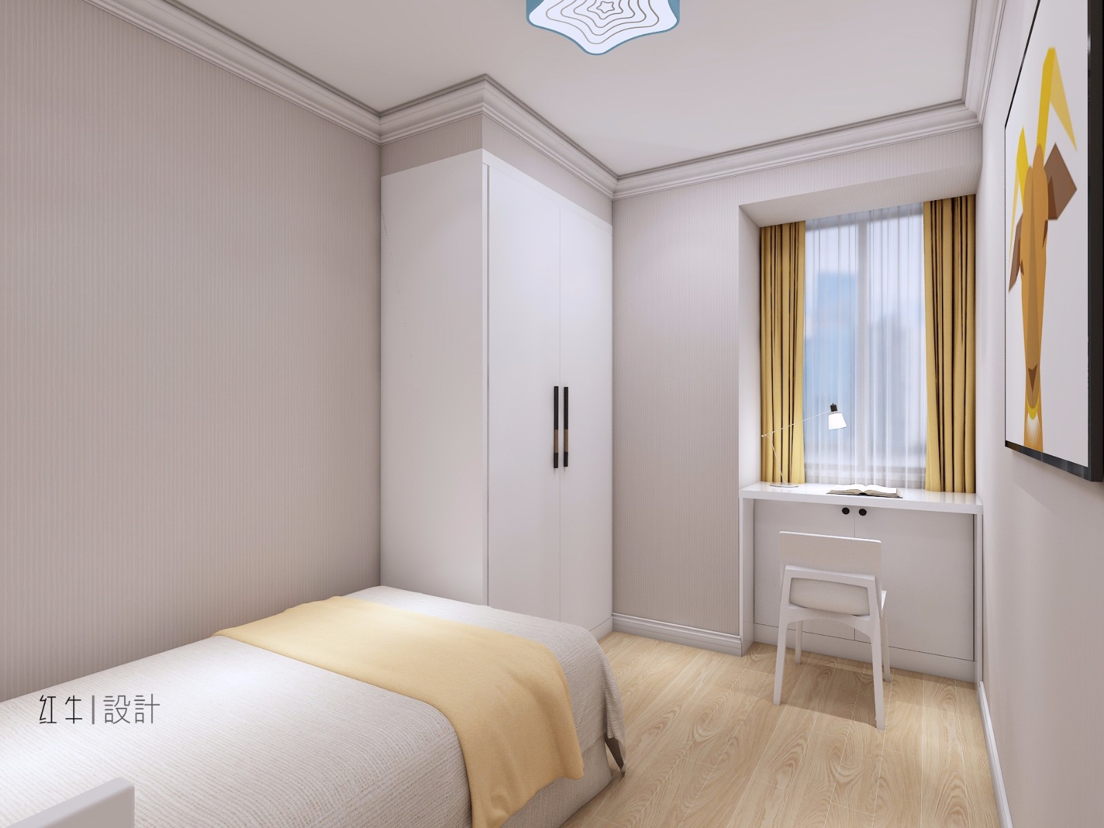 次臥以白色為主色調(diào),并選用淺色地板,使得整個(gè)空間顯得整潔明亮。