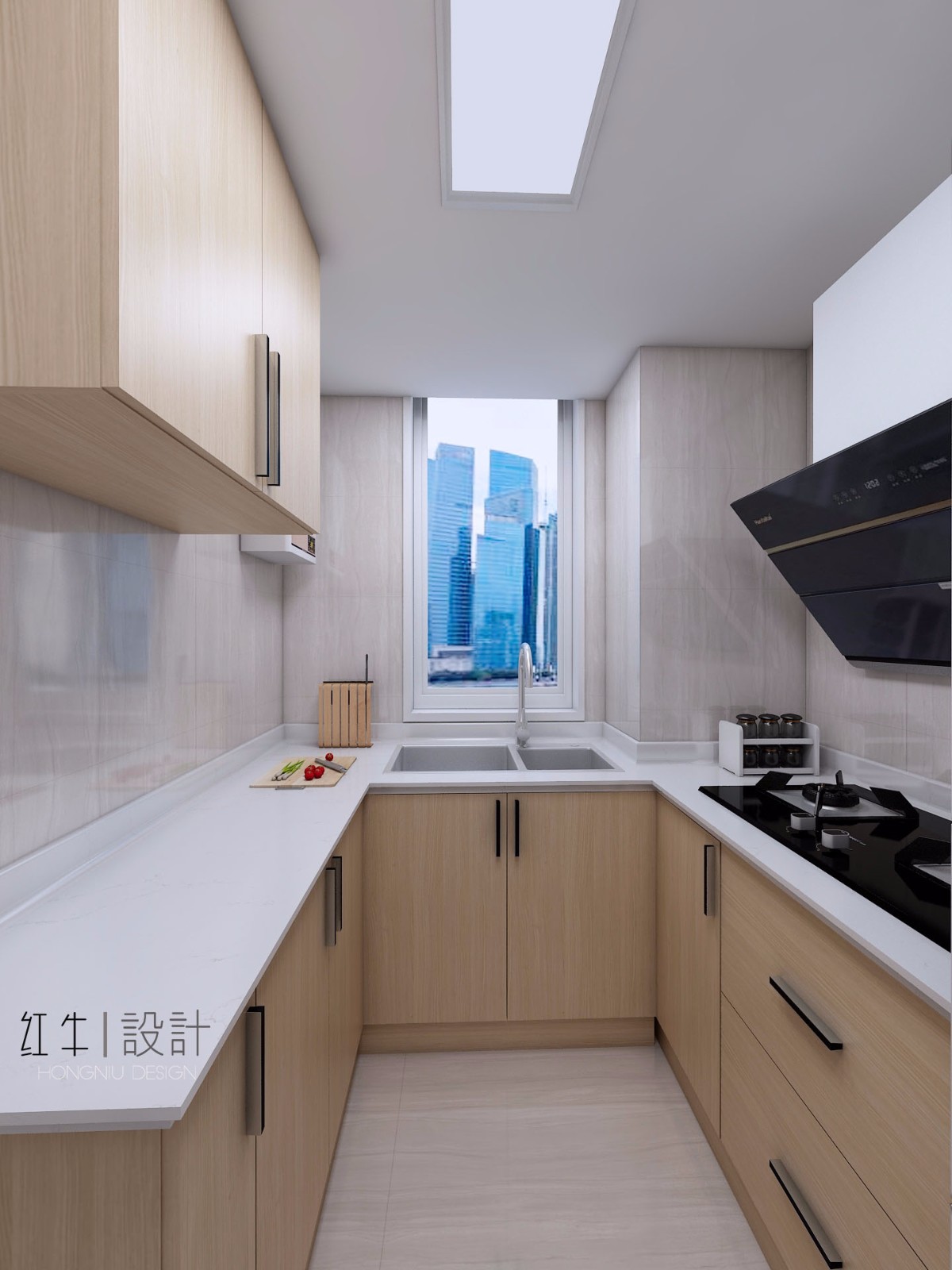 廚房呈U型,各區(qū)域劃分清楚明確,方便操作,雙水槽便于分類清洗。
