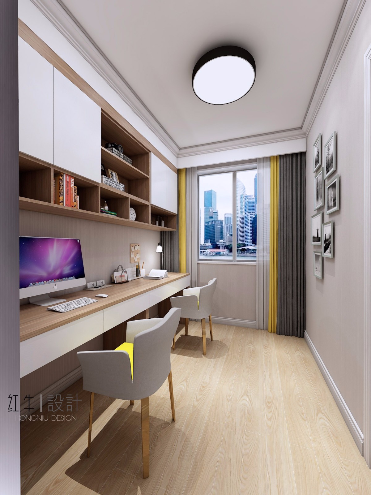 長(zhǎng)書桌的存在,能容納兩個(gè)人同時(shí)使用,所以雖然書房面積不大,卻很實(shí)用。背后空白墻,掛上幾幅裝飾畫,層次變得豐富起來(lái)。