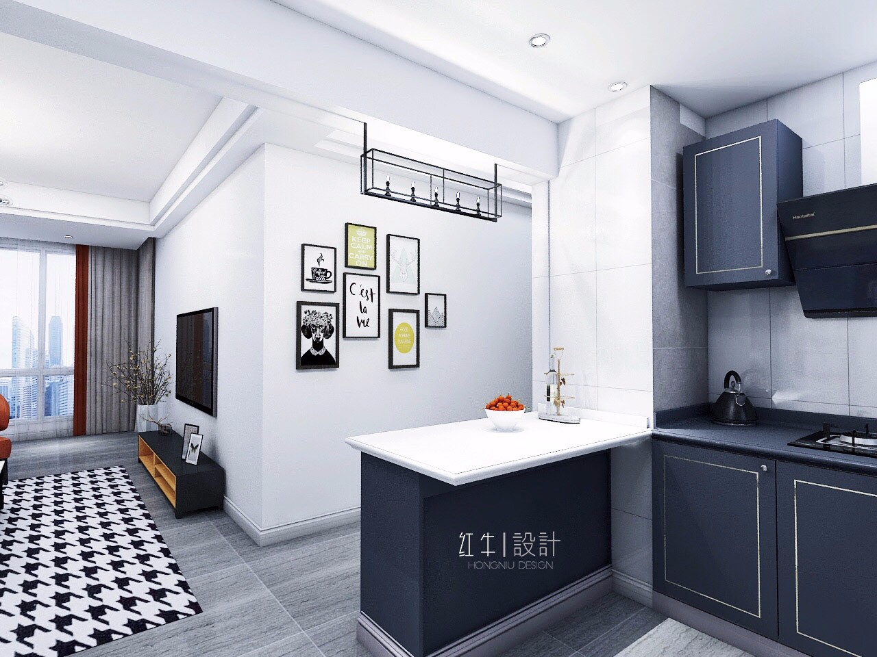 一張雙人沙發(fā),兩邊對(duì)稱(chēng)的邊幾,黑白拼接的長(zhǎng)方形茶幾構(gòu)成了沙發(fā)區(qū),簡(jiǎn)潔卻很舒適。