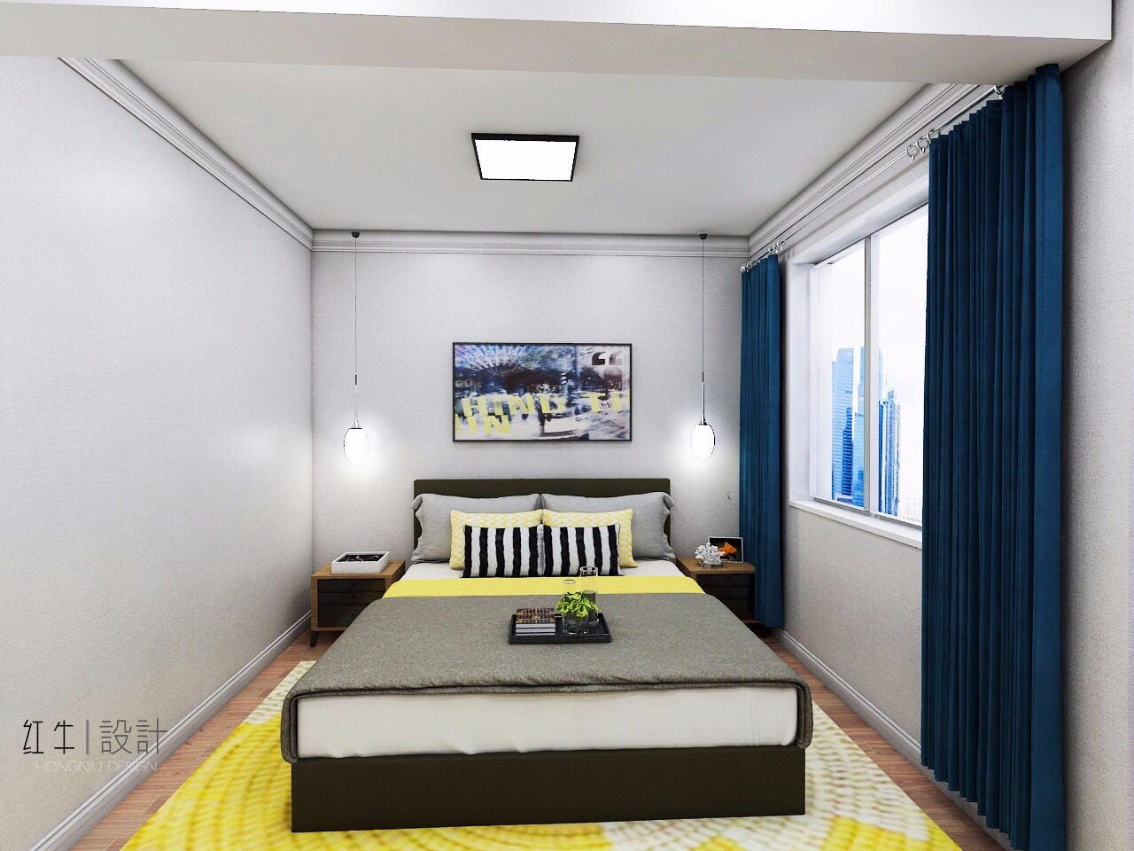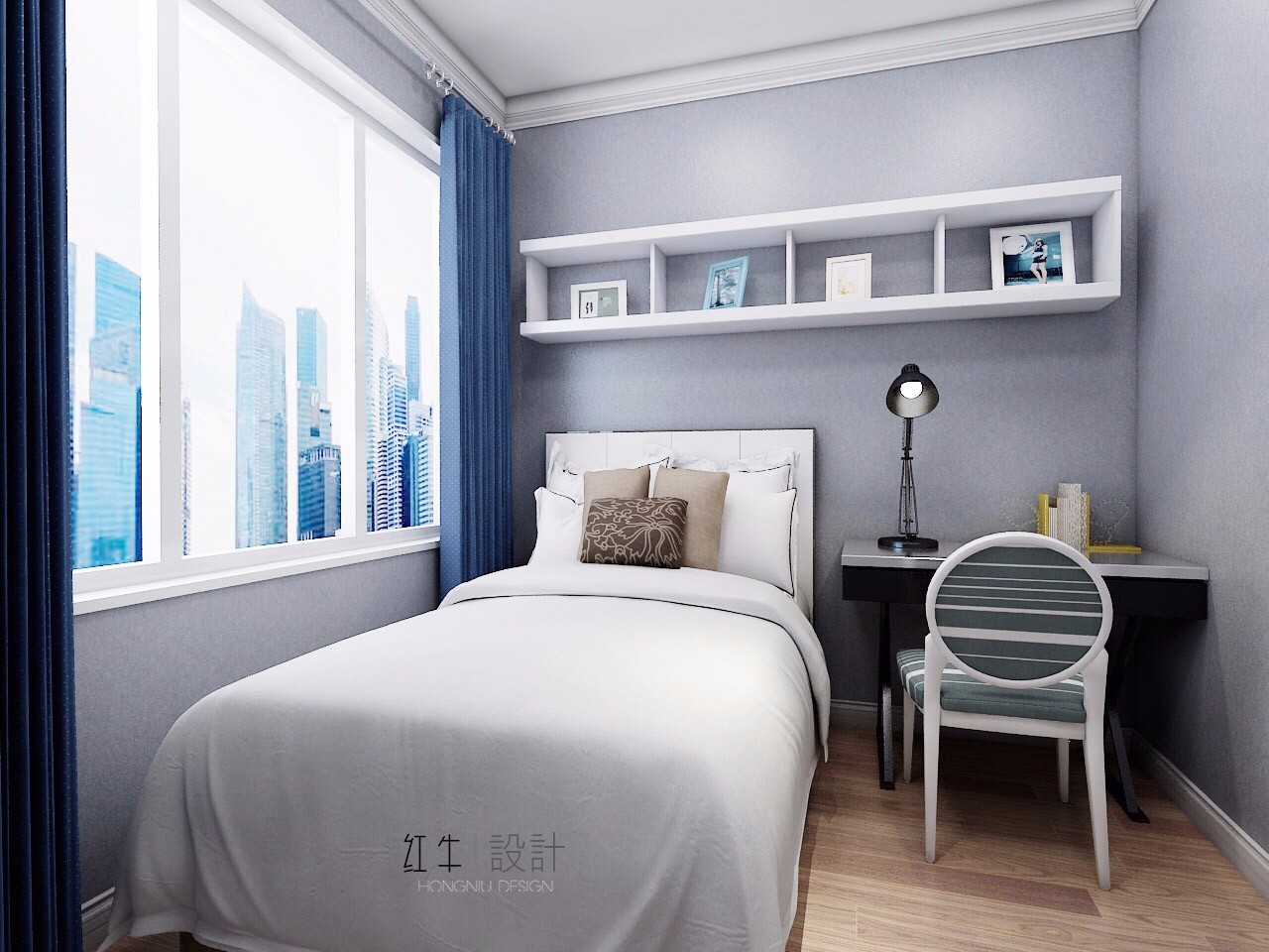 次臥面積比較小,但是大氣的灰色墻壁,搭配白色的床上用品,簡(jiǎn)潔大方,很是舒適。