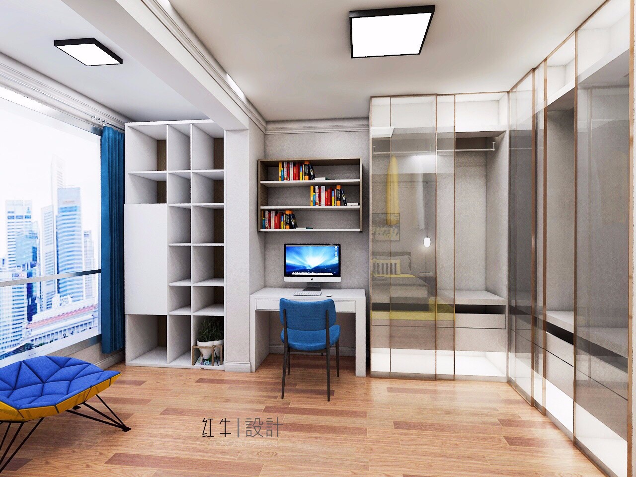 然后就是衣柜部分,柜門(mén)是有色玻璃,玻璃質(zhì)感通透,給人一種精致的感覺(jué),效果很是驚艷。還留了一小塊地方放了張書(shū)桌,平時(shí)可以在此辦公。