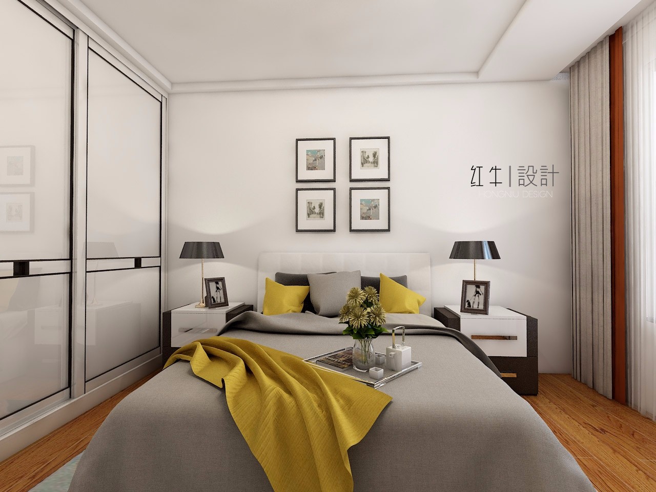 鮮亮的黃色床旗與枕頭的搭配,使人感受到了強(qiáng)烈的視覺沖擊感,整個空間都被點亮了。