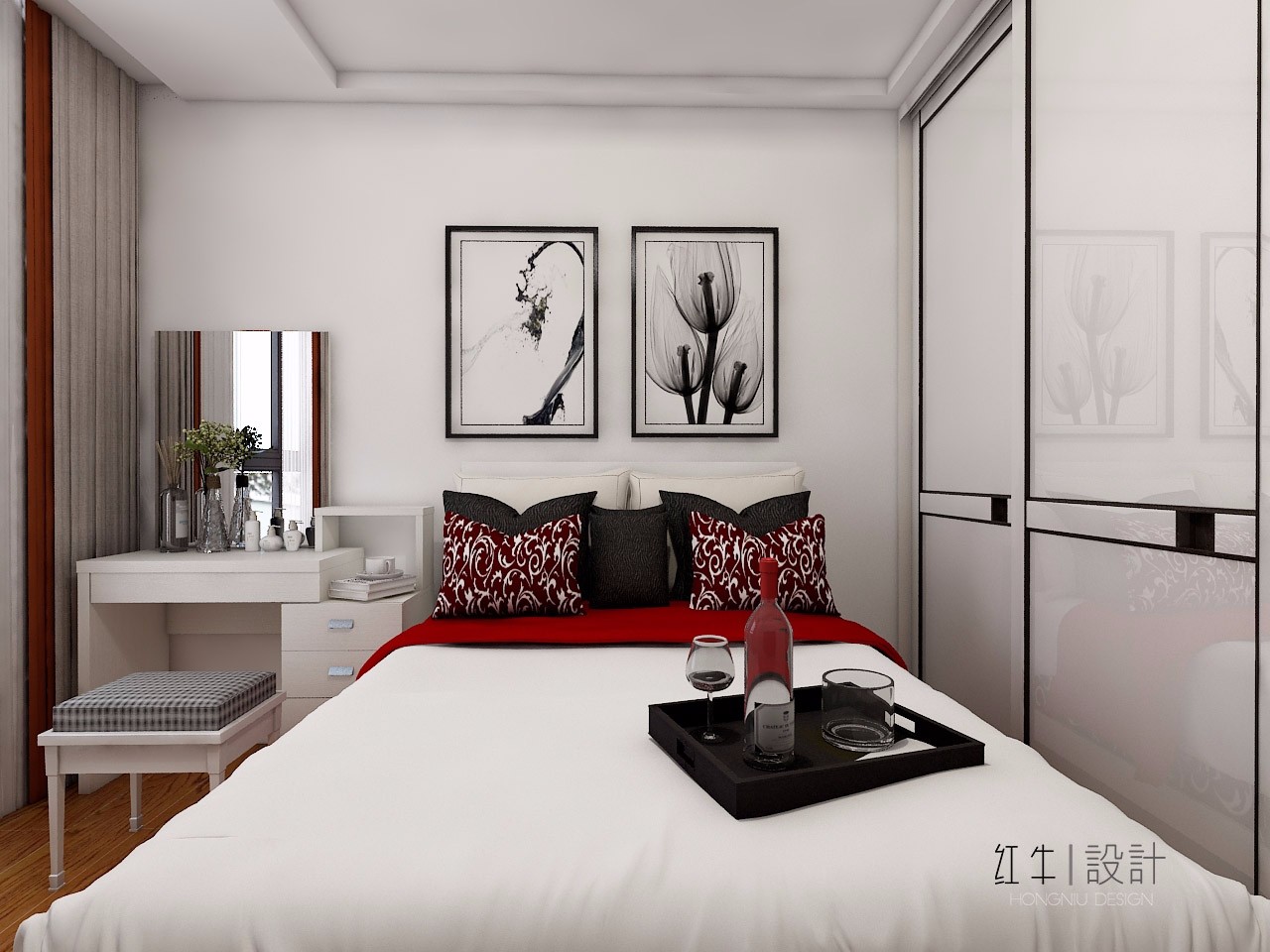 臥室本來是淺色系,但是床品的紅色與花紋讓人在簡約淡雅中又感受到一份絢麗之美。