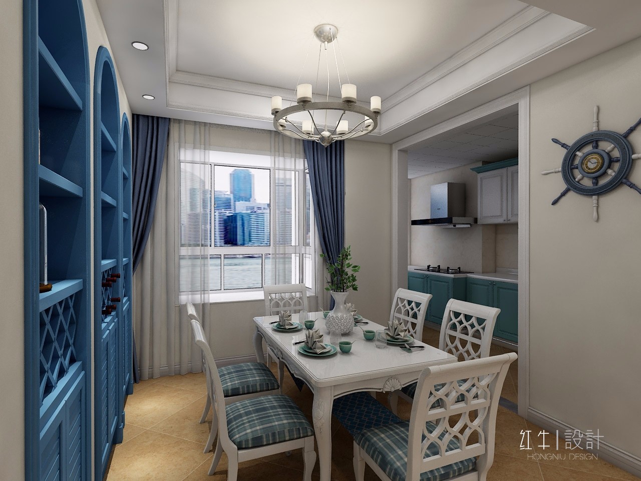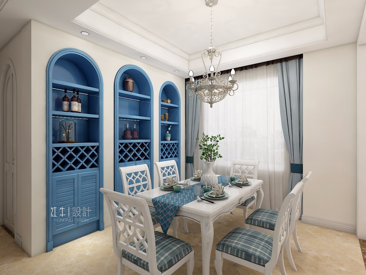 以白色為主色調(diào)的餐廳,顯得尤為純凈雅致,最吸睛的就是藍(lán)色的內(nèi)嵌的置物架,頂部的拱形設(shè)計(jì)就是地中海風(fēng)格的典型特征。