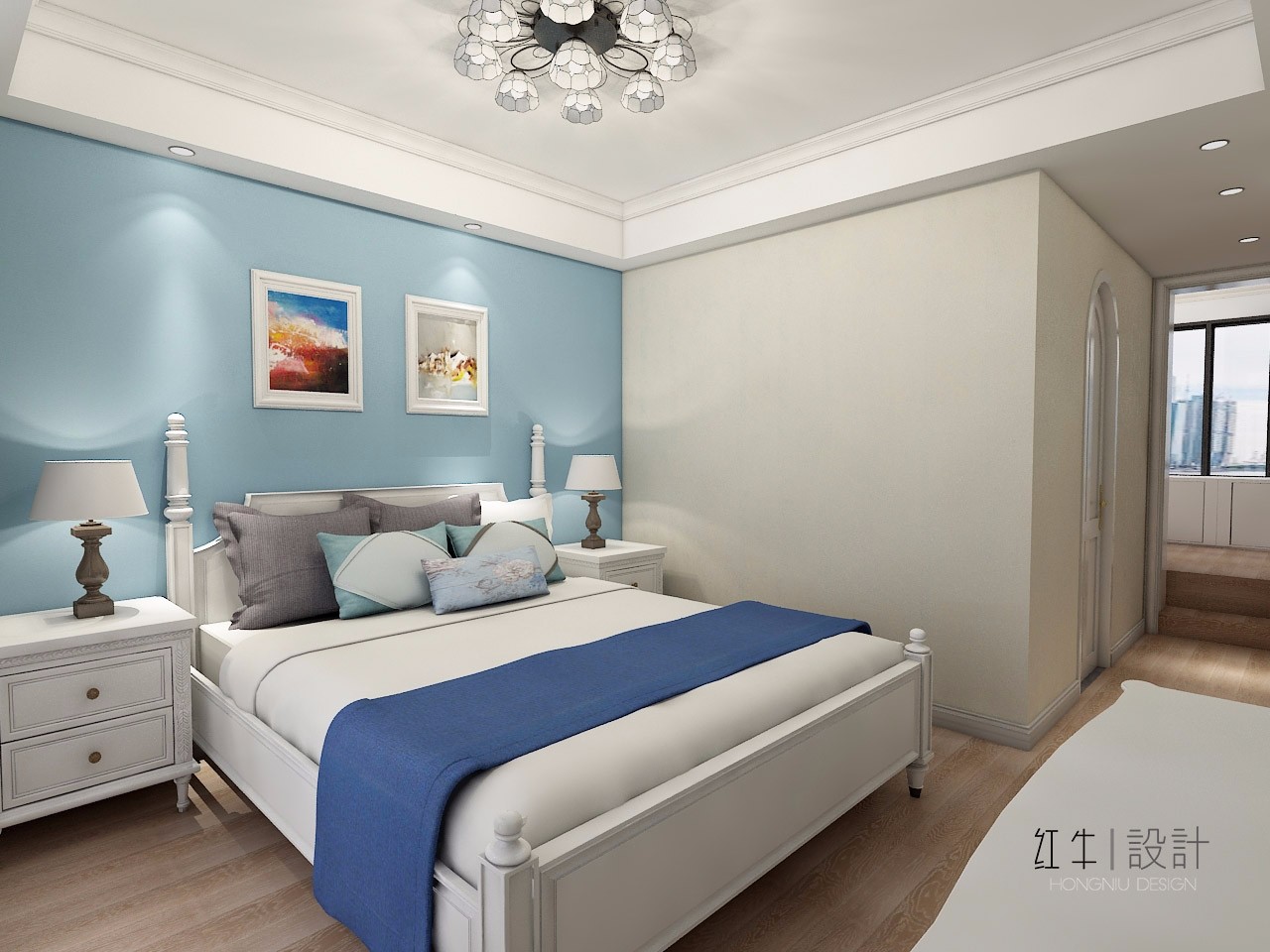 淺藍(lán)色的背景墻簡(jiǎn)非常清爽,給人一種置身海洋的感覺。墻上對(duì)稱懸掛的兩幅裝飾畫,又增添了幾分時(shí)尚氣息。