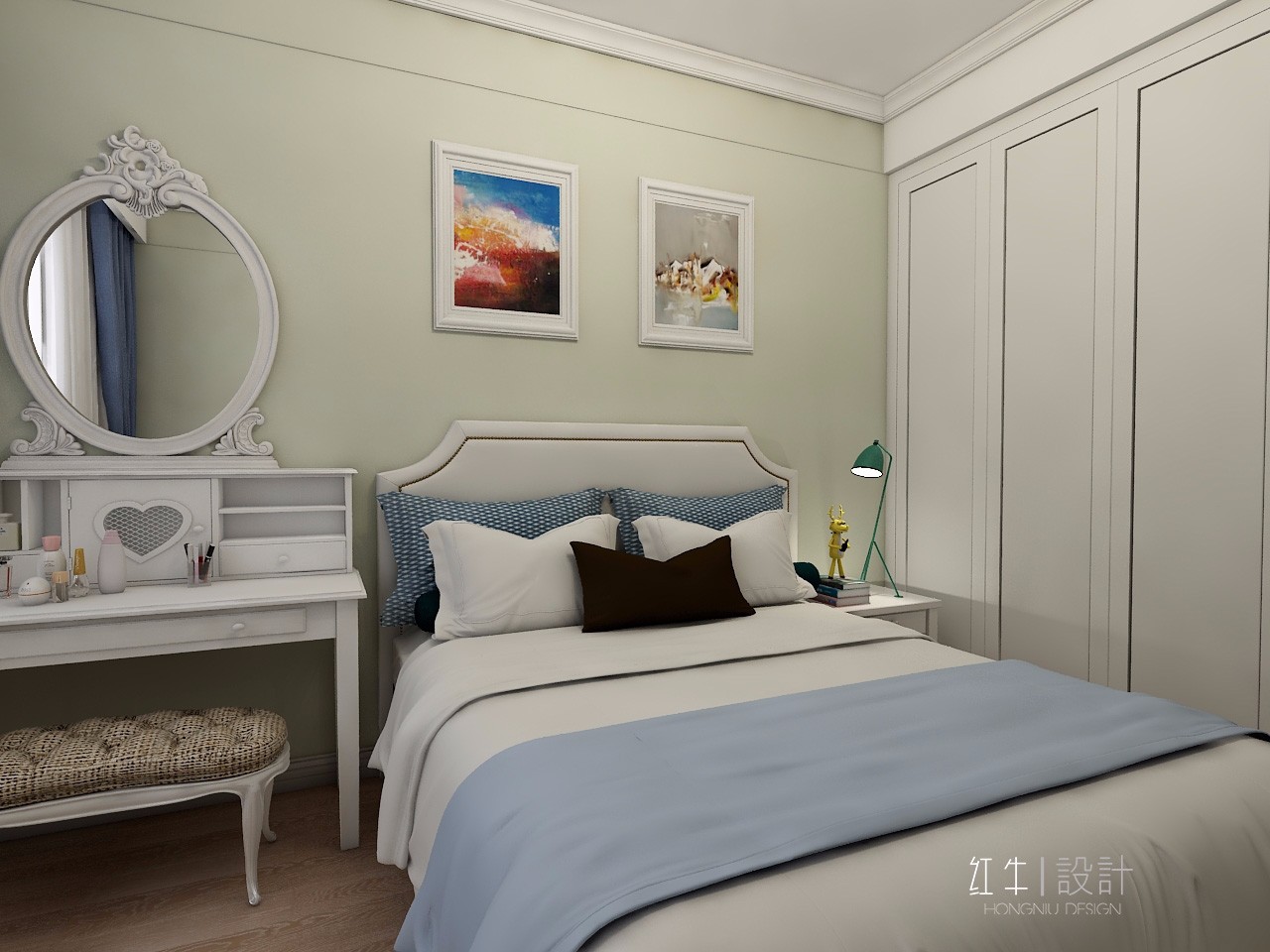 這間是次臥,梳妝臺(tái)是必不可少的家具,它的造型優(yōu)雅、還散發(fā)著一種浪漫氣息。