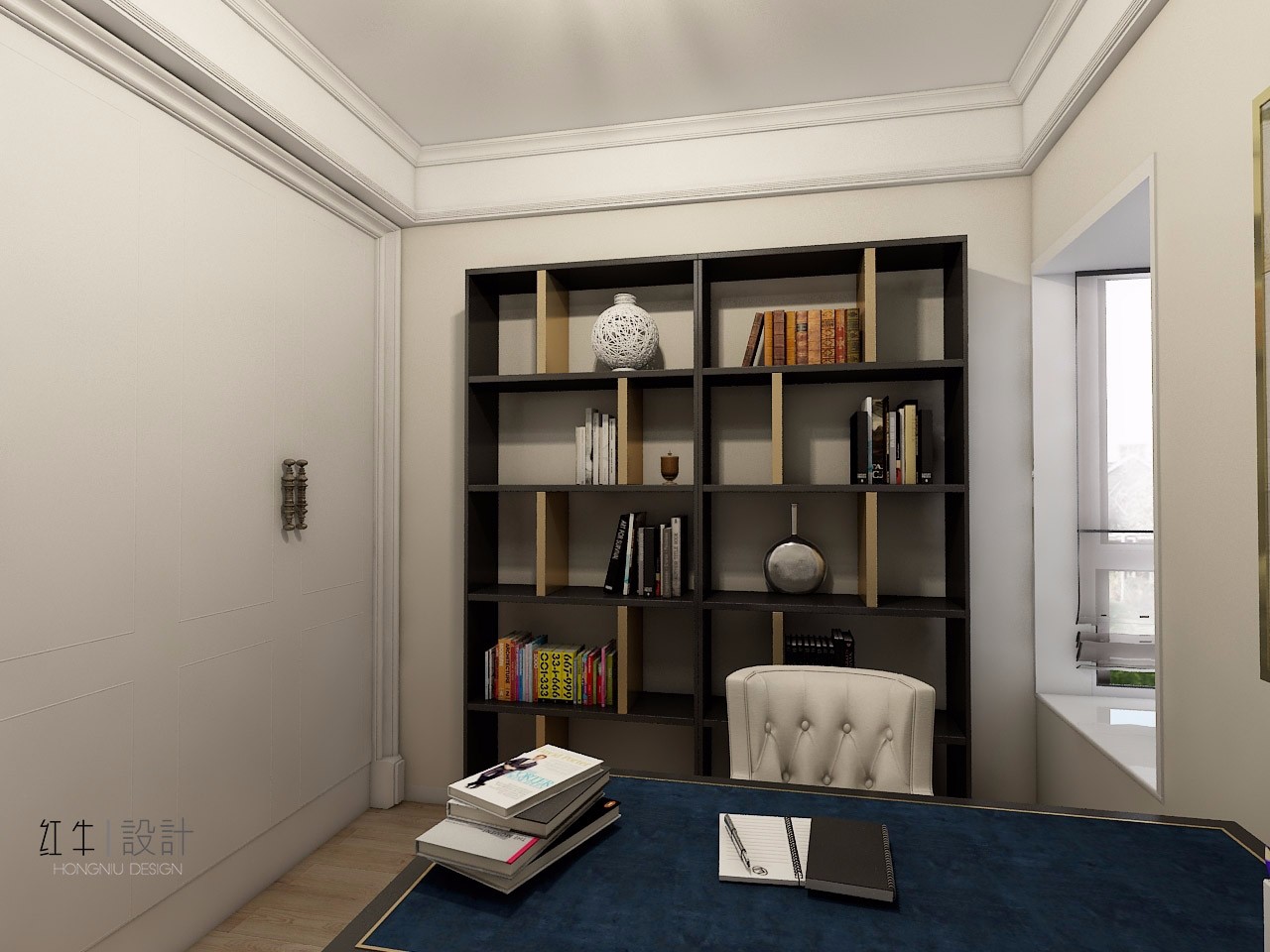 這就是主臥大套房中的書房,書架依墻而立,上面擺放著工藝品和書籍,看似無意卻頗有藝術(shù)感,剩下的就是看書學(xué)習(xí)時(shí)使用的一桌一椅,總體來說,書房簡(jiǎn)單卻不乏味。