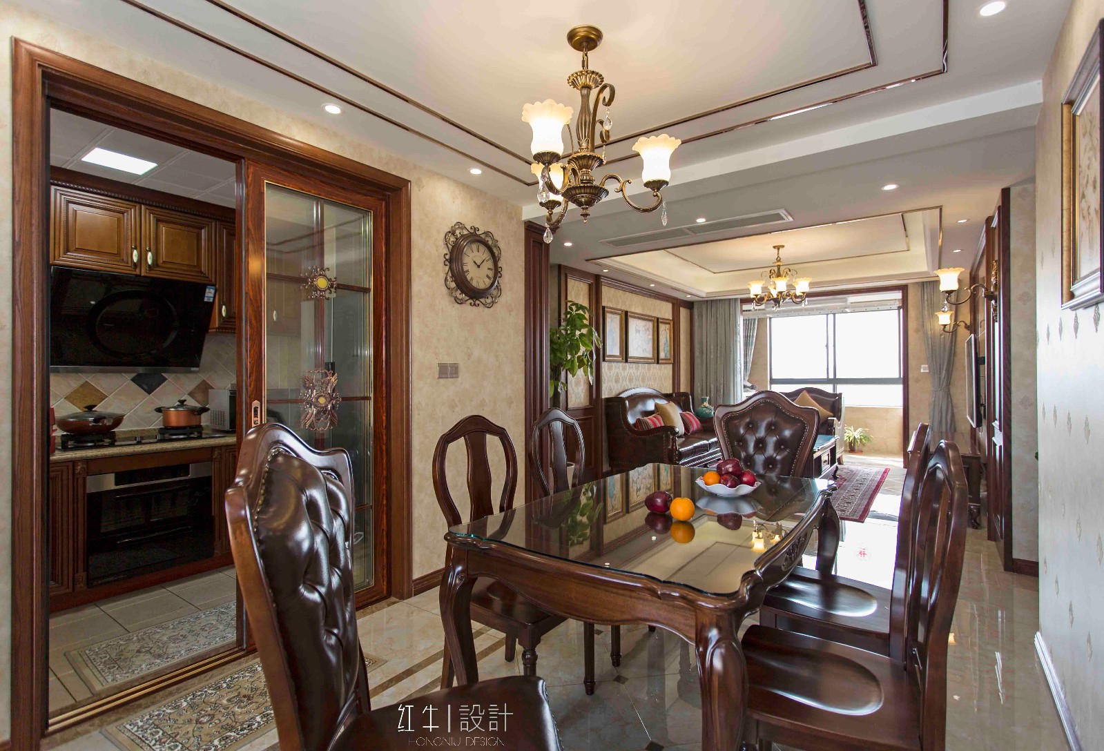 餐廳與廚房之間,采用了木框透明玻璃滑門隔開,使得空間更加通透。
