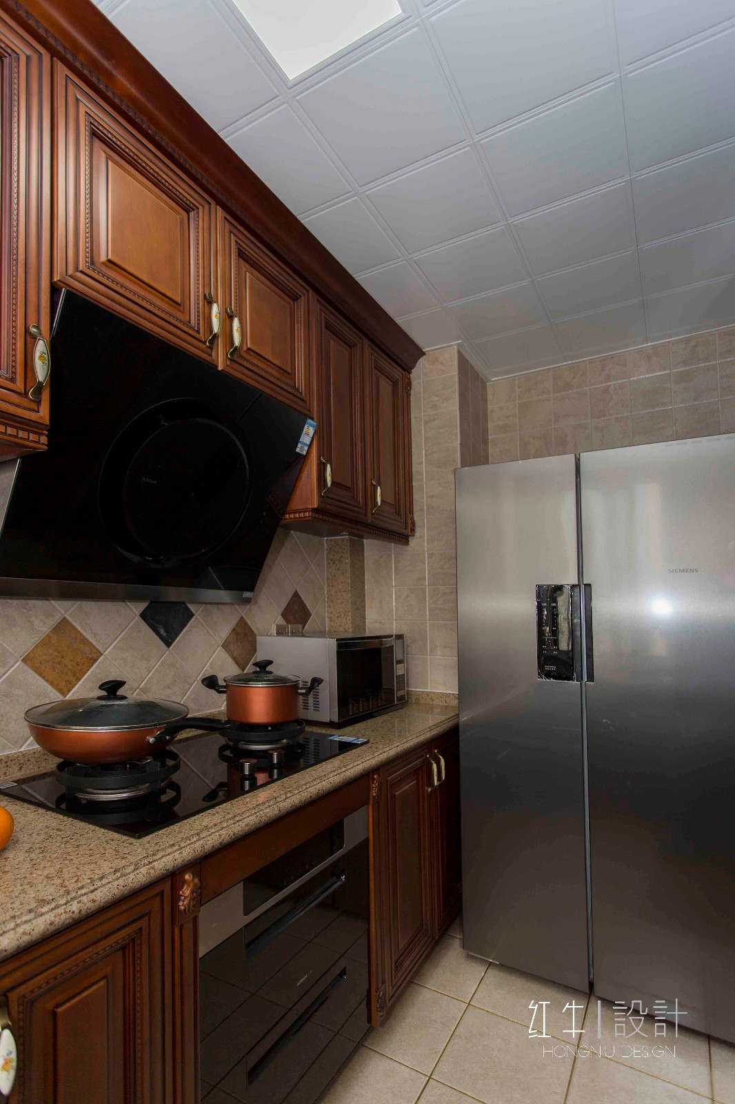 關(guān)注細節(jié)可以發(fā)現(xiàn),廚房柜門的把手都是復(fù)古樣式的。此外,墻磚采用斜鋪的方式,視覺效果很不錯,加上點綴了一些不同顏色的墻磚,趣味十足。
