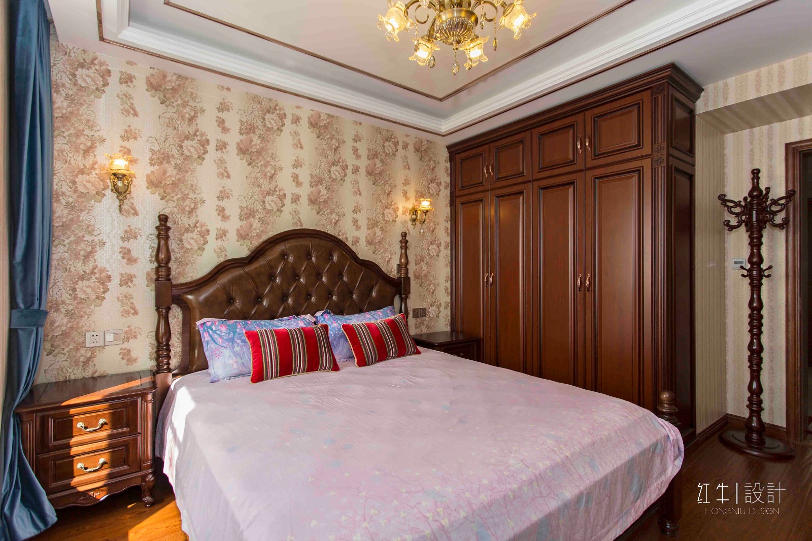 壁燈造型與壁紙花紋很和諧,顯得非常古典。從窗外撒進來的陽光也可以表明白天采光很不錯。