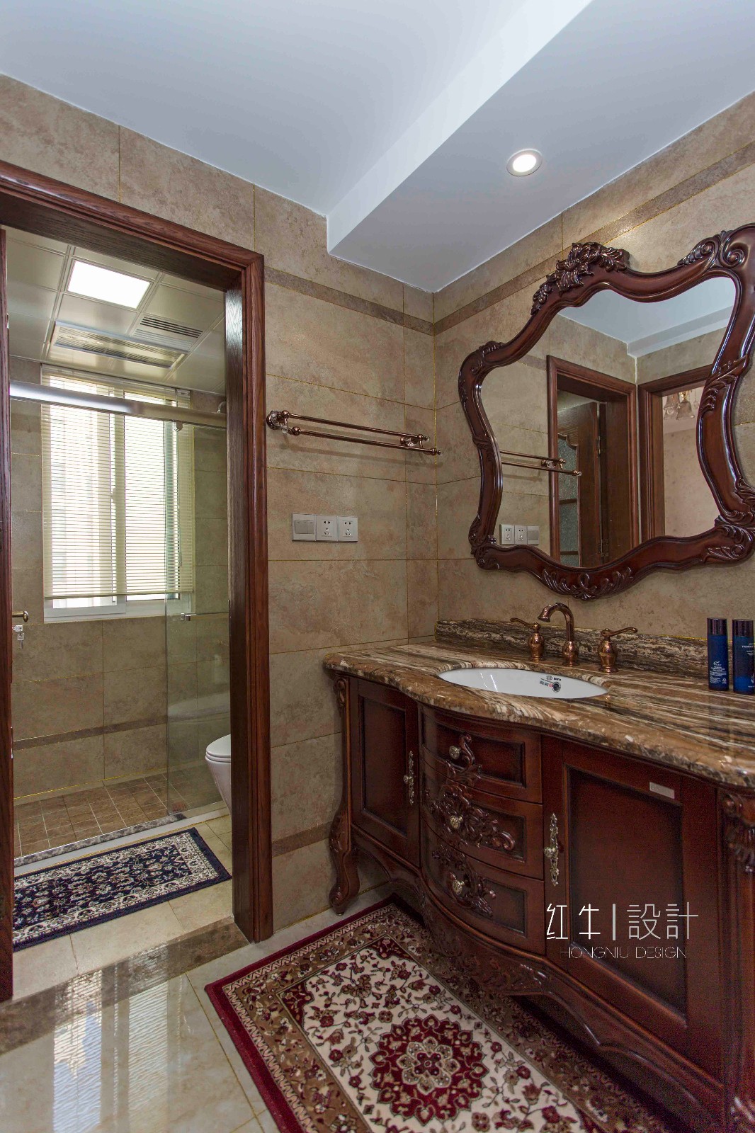 衛(wèi)生間的設(shè)計,是將洗臉池獨立出來,干濕分離非常徹底。木框花邊大鏡面嵌在墻上,帶有一種復(fù)古韻味,搭配帶紋理的衛(wèi)浴柜臺面,古樸且有設(shè)計感。