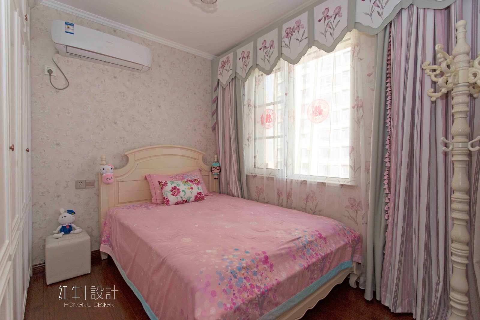 次臥是兒童房,所以除了地板都是淺色系,這樣的色彩搭配讓整個空間變得明亮起來。窗簾與窗幔令臥室充滿柔情,床頭玩偶的裝飾加上粉色的床品,顯得甜美而又青春洋溢。