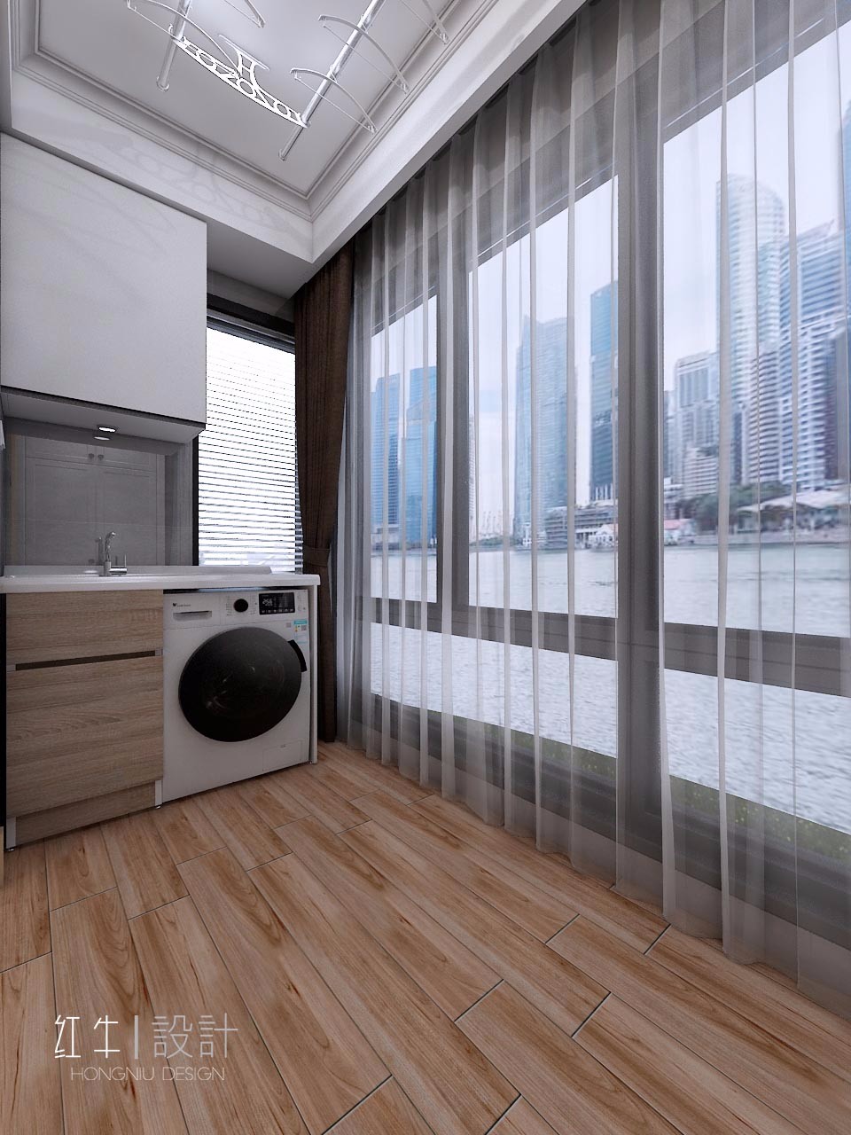 洗衣機(jī)放在陽臺(tái),洗衣晾衣一氣呵成,不用為了晾衣服跑來跑去。木質(zhì)地板很有溫馨質(zhì)感。