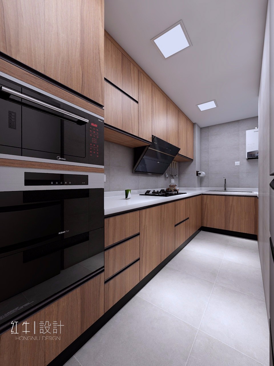 L型廚房,操作便利,嵌入式廚電設(shè)計使之不顯凌亂。