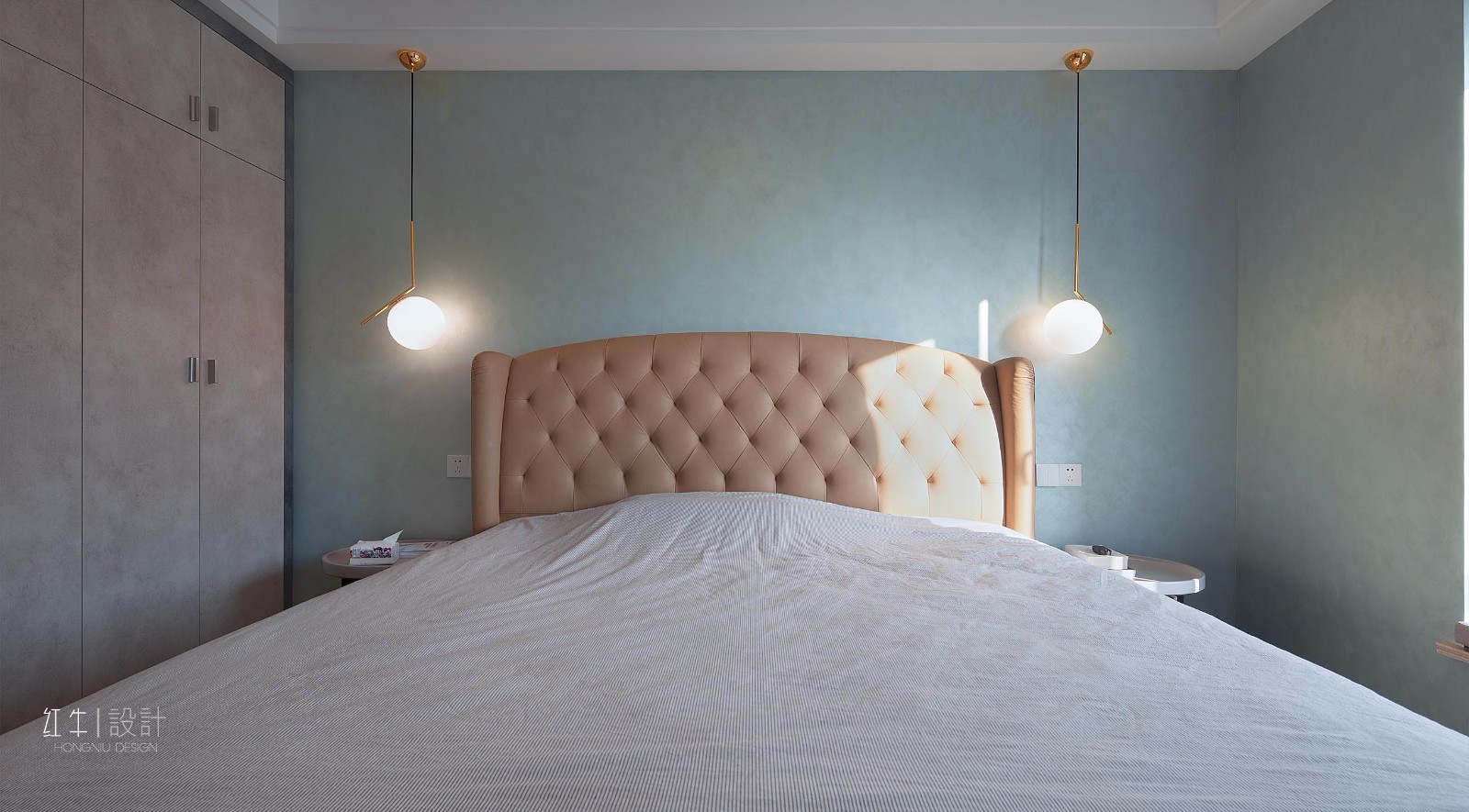 主臥室簡單顯主人家的生活細致,閱讀燈的點綴更添氛圍,整體的風格及色彩的運用都是使空間更顯舒適輕松安靜的氛圍,放松、愉悅。