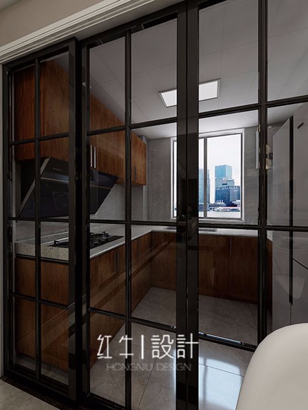 黑框玻璃門顏值頗高,自成視覺焦點,隔而不斷,營造出空間的通透感。
