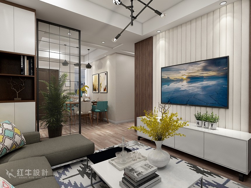 餐廳與客廳之間有一道玻璃隔斷,區(qū)域之間有了劃分,同時(shí)又能透光。白色豎條紋造型的電視背景墻與整體風(fēng)格和諧統(tǒng)一,又有著自己獨(dú)特的小別致。
