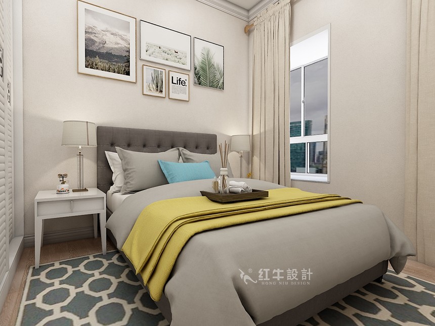 淺色的墻壁背景下,深灰色的大床加上淺灰色的床品,再搭配上地毯,整體感覺簡(jiǎn)潔優(yōu)雅,黃色的加入提亮了空間,給人恰到好處的溫暖。