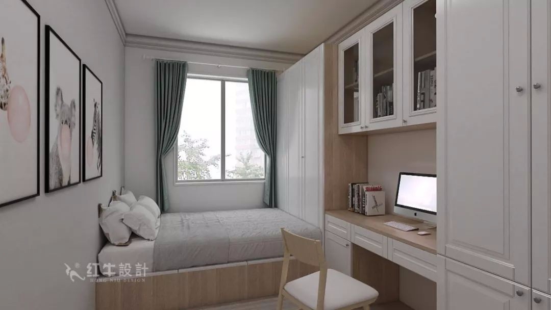 次臥設(shè)計成榻榻米房,將睡眠空間、閱讀空間和收納空間結(jié)合起來,木色的整體柜體搭配白色的歐式面板讓空間顯得簡潔舒適。
