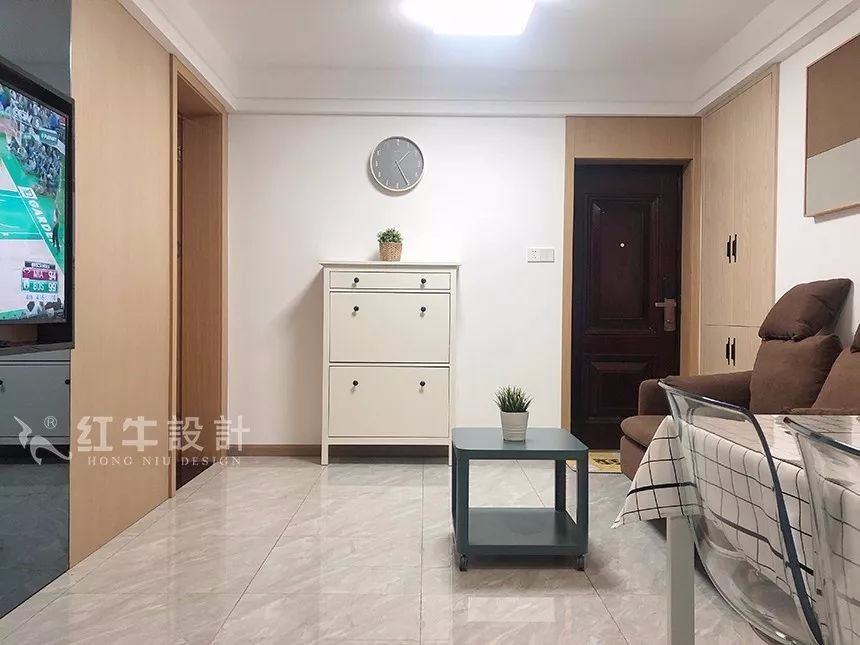 一進(jìn)門,映入眼簾的就是客餐廳。倚墻而立的白色玄關(guān)柜,搭配上懸掛的鬧鐘,讓這面墻不再單調(diào)。