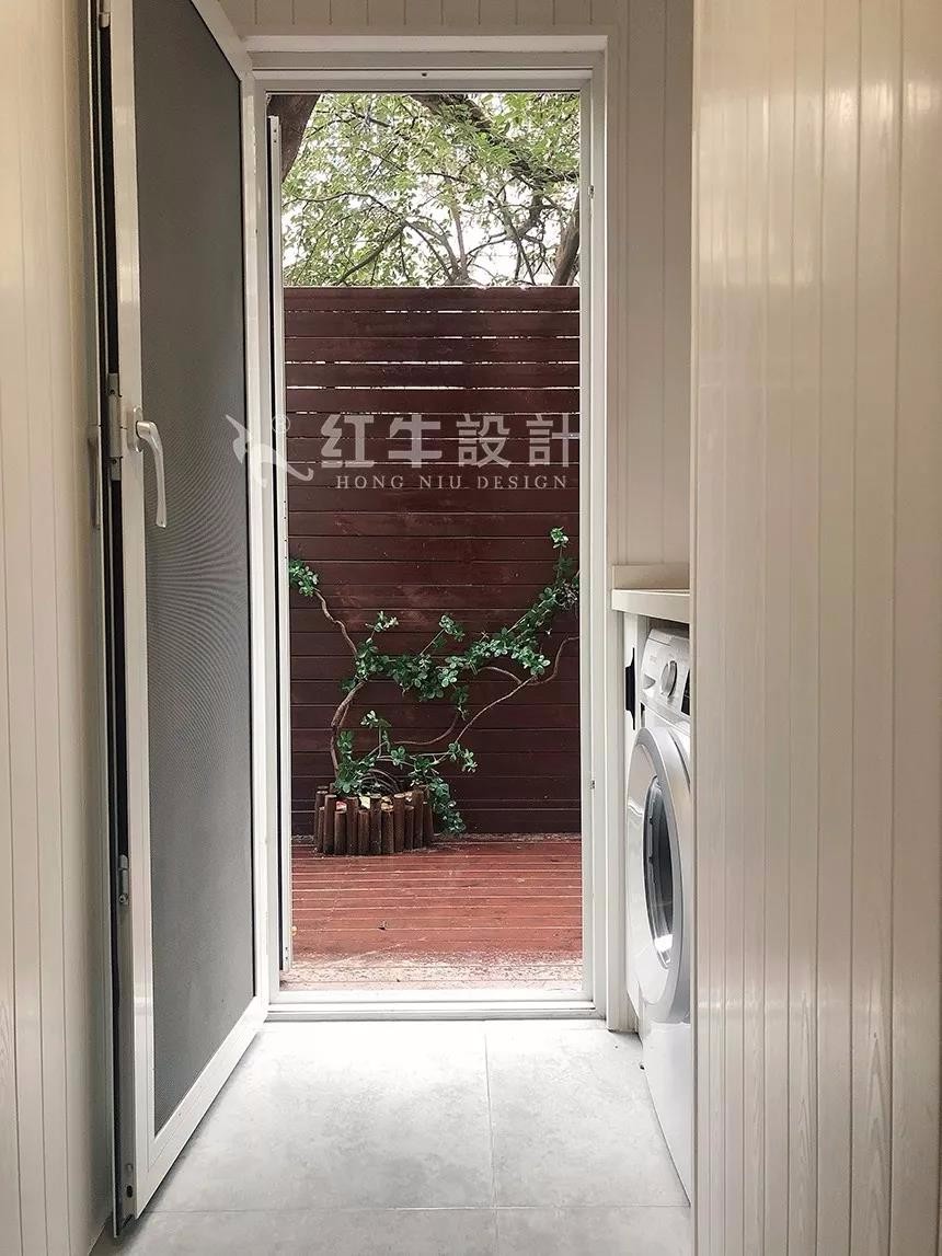過(guò)道通向外面的小院,這邊放置了洗衣機(jī),相鄰處背面是廚房放置冰箱的位置,空間得到了很好的利用。