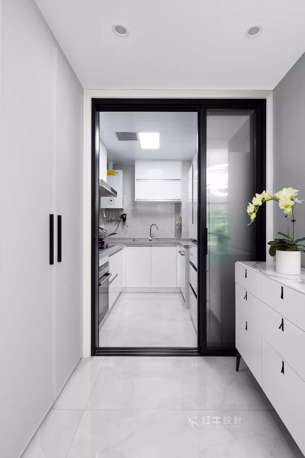 餐廳到廚房之間的過道沒有浪費,一面設(shè)計了頂天立地的收納柜,一面是可以擺放裝飾品的斗柜。