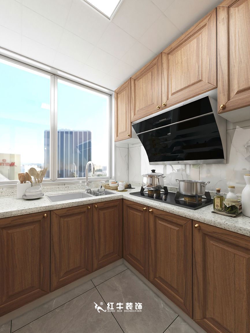 實(shí)際施工的時(shí)候,廚房里沒(méi)有做吊柜。原因有兩點(diǎn),一是客戶(hù)家在二樓,光線(xiàn)比較差,做吊柜可能比較壓抑;二是需要爬高去拿東西,對(duì)業(yè)主來(lái)說(shuō)可能不算很方便,所以就把吊柜給取消了。