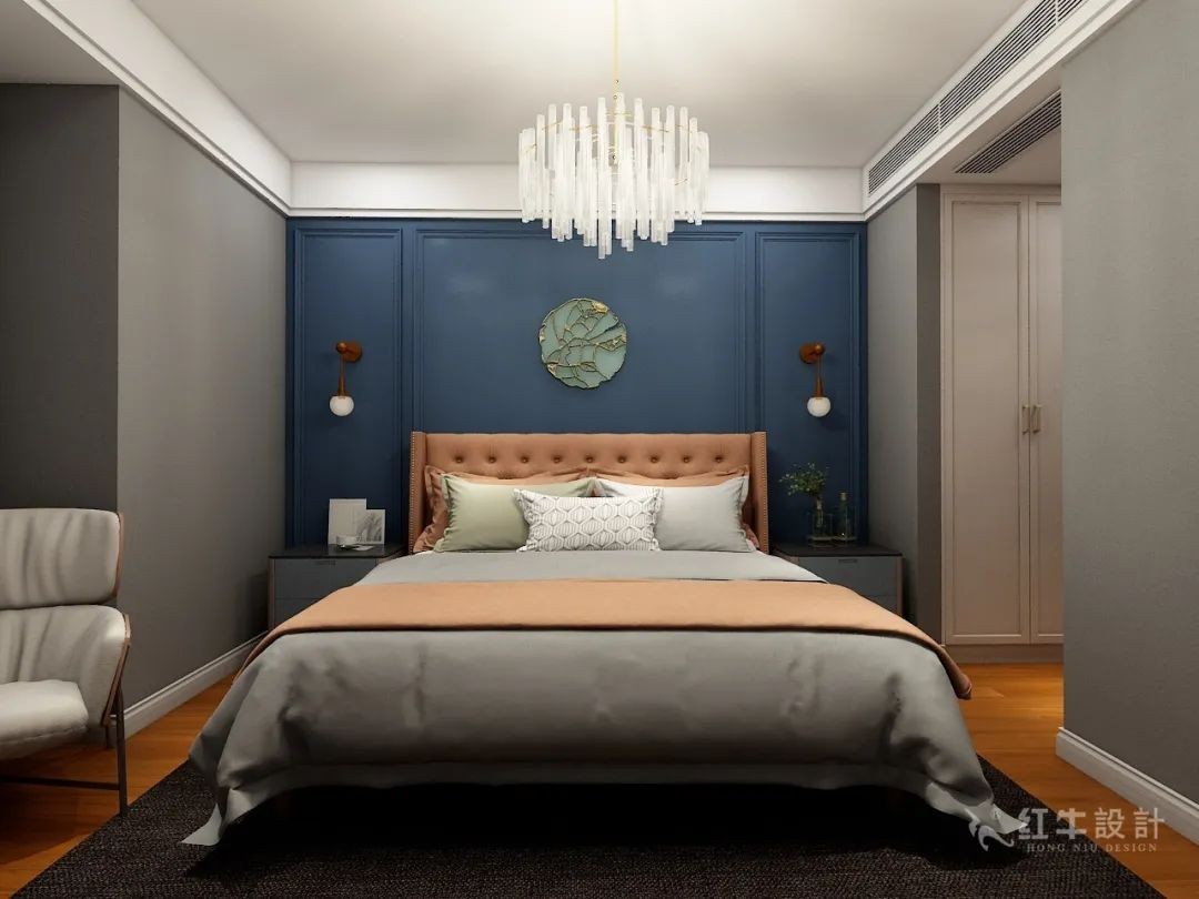 臥室色調(diào)呼應(yīng)客廳,橘色的床凸顯了臥室空間是以床為主體,金屬的壁燈與吊燈的呼應(yīng),使空間更加時尚。